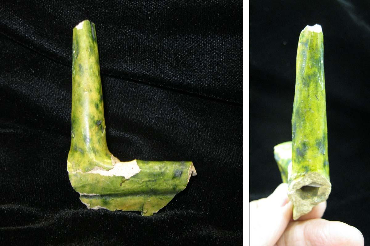 We may never know how this loss occurred, but perhaps it resulted from the sort of entertaining activities which we can visualise associated with another find from the excavation, the spout from a puzzle jug. This vessel conjures up pictures of drunken revelry in 16th century Salisbury. Puzzle jugs were vessels, often used in riotous drinking games, which challenged an unsuspecting victim to consume drink by sucking the contents through a hollow spout which was connected through the rim and handle to the body of the jug. Given the use it is unsurprising that many got broken.