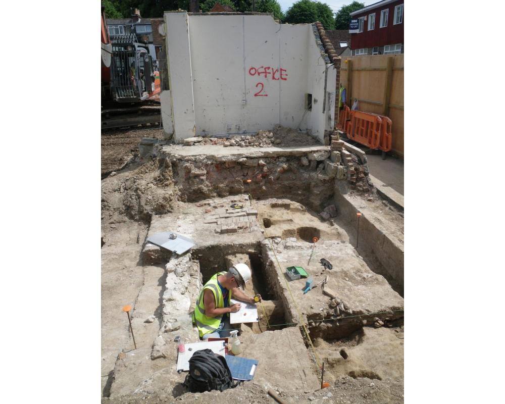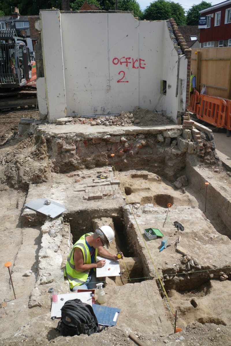 Excavations subsequently progressed to a block of land on the south side of Salt Lane. Further evidence of medieval clay extraction was found, after which plots were maintained as cultivated ground or yards which were divided by tenement boundaries. Buildings were not erected until the 15th -16th centuries possibly in tandem with developments on the opposite side of Salt Lane in Vanner’s Chequer. Alterations were undertaken in the 16th -17th centuries when bricks were first used in construction with further rebuilding in the 19th century.