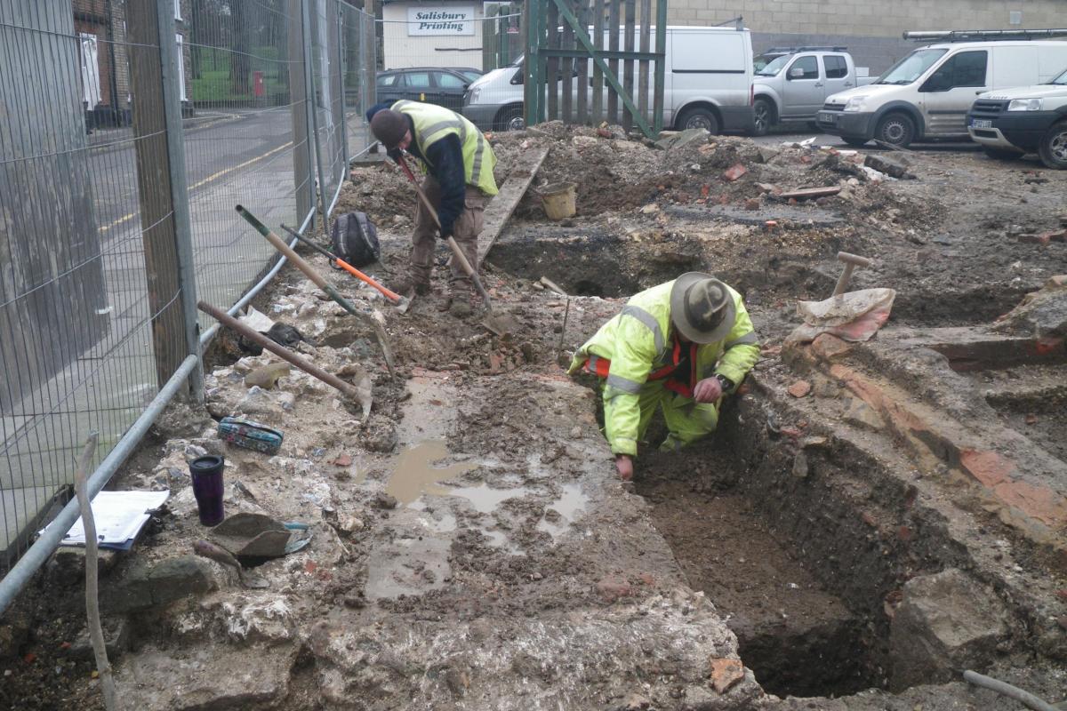 Vanner’s Chequer, one of the 20 medieval chequers in Salisbury, occupies the extreme north-east corner of the medieval city. Its location, on Bourne Hill, meant that it could not be included in the system of medieval water courses which flowed through the city. It was uncertain about whether this more peripheral location had developed at the same pace or had lagged behind other parts of the city. Preliminary trial trenches located 13th – 14th century rubbish pits and cess pits, which indicated that people had indeed lived along Bedwin Street from the foundation of Salisbury. Buildings on Salt Lane, in contrast, appeared to date from the 17th century suggesting a slight delay in the pace of development. The central part of the chequer, the ‘back-lands’, contained yard surfaces, outhouses and garden boundary walls.