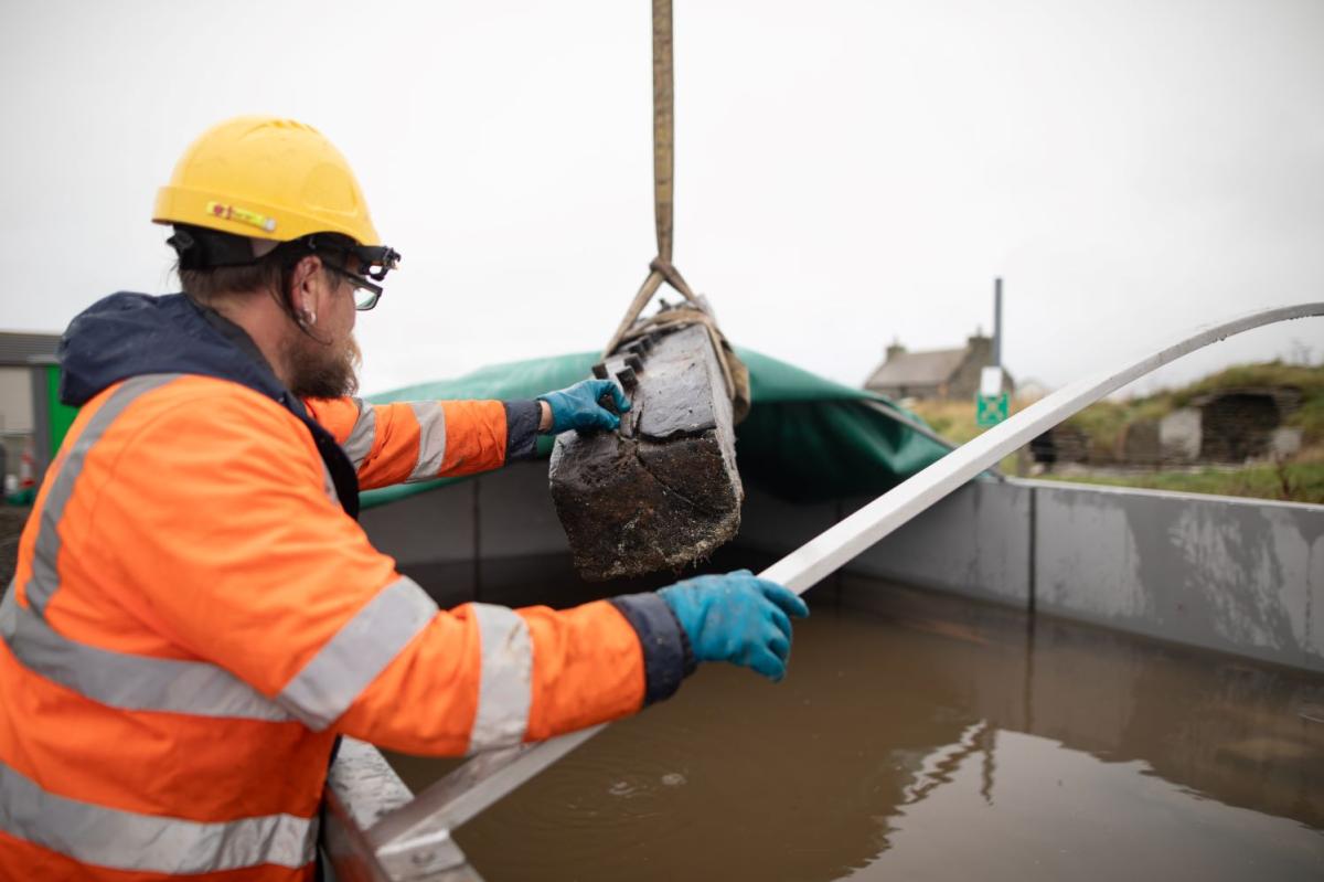 The future of the wreck’s timbers was secured thanks to an £79,658 grant from the National Heritage Memorial Fund (NHMF) to Orkney Islands Council, on behalf of the Sanday community, for a huge freshwater tank to house the wreck and protect it from deterioration. Wessex Archaeology were on hand to oversee the delicate task of transferring the timbers to their new home.