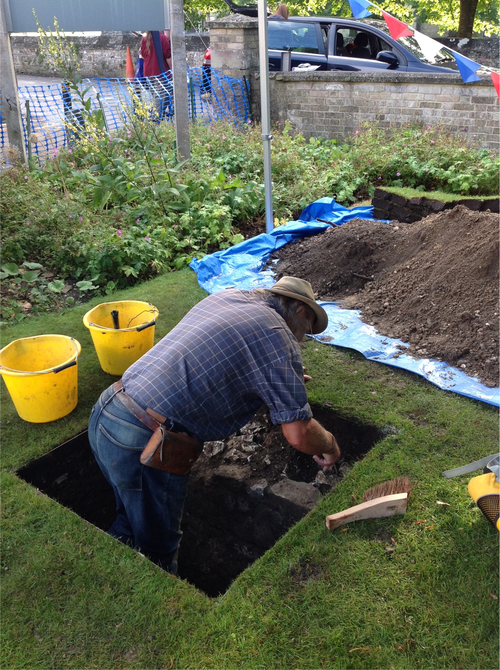 In what has rapidly become an annual institution, Phil Harding and Lorraine Mepham joined this year’s Festival of Archaeology to dig a hole in the Museum’s front garden. The aim was to find evidence of the gatehouse for the King’s House which was listed in the Parliamentary Survey of 1649, and depicted in a sketch from 1799, but of which there is now no trace above ground. A preliminary geophysical survey picked up responses suggesting walls, and a 1-metre square test pit was placed to pick up one of these. Work started on Saturday morning, and the remains of the wall were swiftly uncovered. By late afternoon we had exposed the wall down to its foundations, and dug through a series of layers, including a medieval make-up layer containing many fragments of roof tiles, possibly hardcore used to raise the ground level. We were fortunate enough to find good dating evidence for the gatehouse too – a clay tobacco pipe with a maker’s mark came up from the wall’s construction cut, and this could be dated quite closely to the middle of the 17th century, just before the time of the Parliamentary Survey. Rubble from the gatehouse’s demolition included pottery sherds and a glass bottle dating to the late 18th or early 19th century, and once more this tallied with the historical sources – there is a documentary note of the demolition in 1803. The owner of the King’s House at the time was said to have kept a good wine cellar, so the glass bottle that we found could well have come from this! Thanks to Adrian Green and to Owain Hughes of Salisbury Museum for inviting us back to the Festival, and to all those who turned out to visit, despite the weather. We were very glad of our gazebo covering!