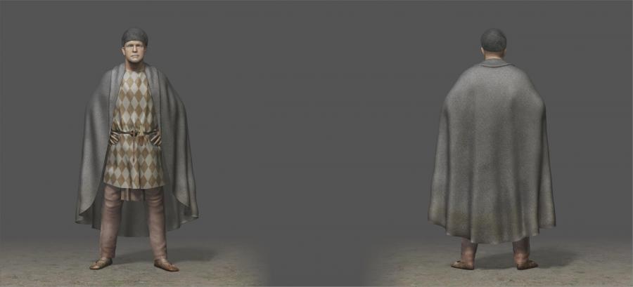 Evidence for clothing, especially in Britain, is limited so I looked at a number of different European sources for inspiration. The Danish Mound People were a particularly useful source of information especially for the cloak and hat. The hide leggings and loincloth were based on the earlier technology of Otzi ‘the iceman’. He’s shown wearing a sleeveless tunic with a diamond pattern inspired by the styles of geometric patterns appearing on contemporary pottery. The aim was to produce a striking garment to lend weight to the importance of this individual. The knife was added in a simple leather sheath attached to a belt secured in a belt loop.