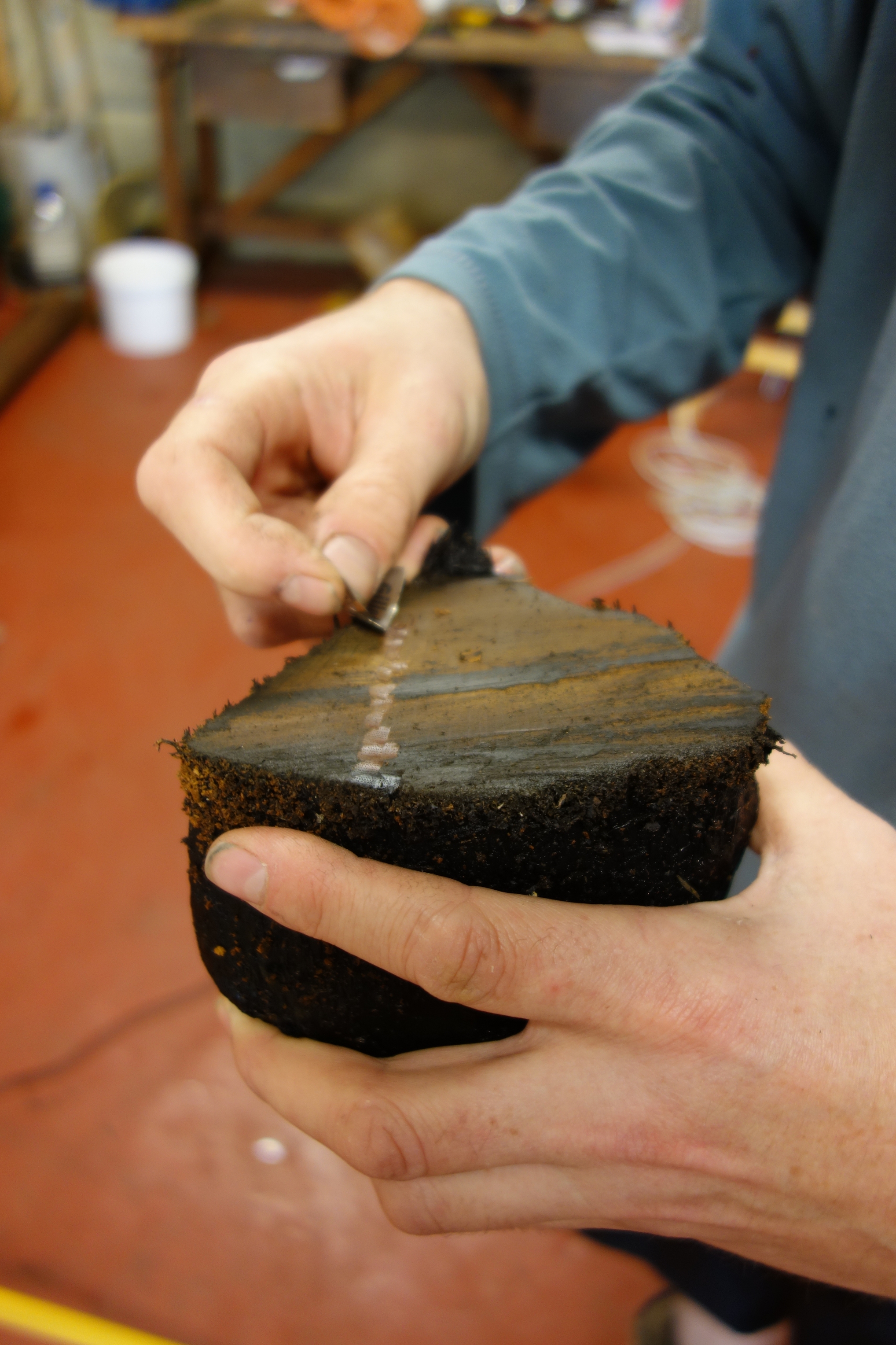 The timber artefacts had been stored in tanks of water at Wessex Archaeology to prevent them from drying out. They were carefully removed from their water tanks so that the experts could assess their potential for dendrochronological dating. This involves taking a section through the timber to allow the annual growth rings to be counted, to show the number of years the tree was alive and to measure the thickness of the rings to show the yearly growth conditions. In general, it is preferable to have at least 50 tree rings to get reliable results. As it is a destructive testing method, experts must be fairly certain that the artefact has enough tree rings to provide a date, otherwise important information may be lost.