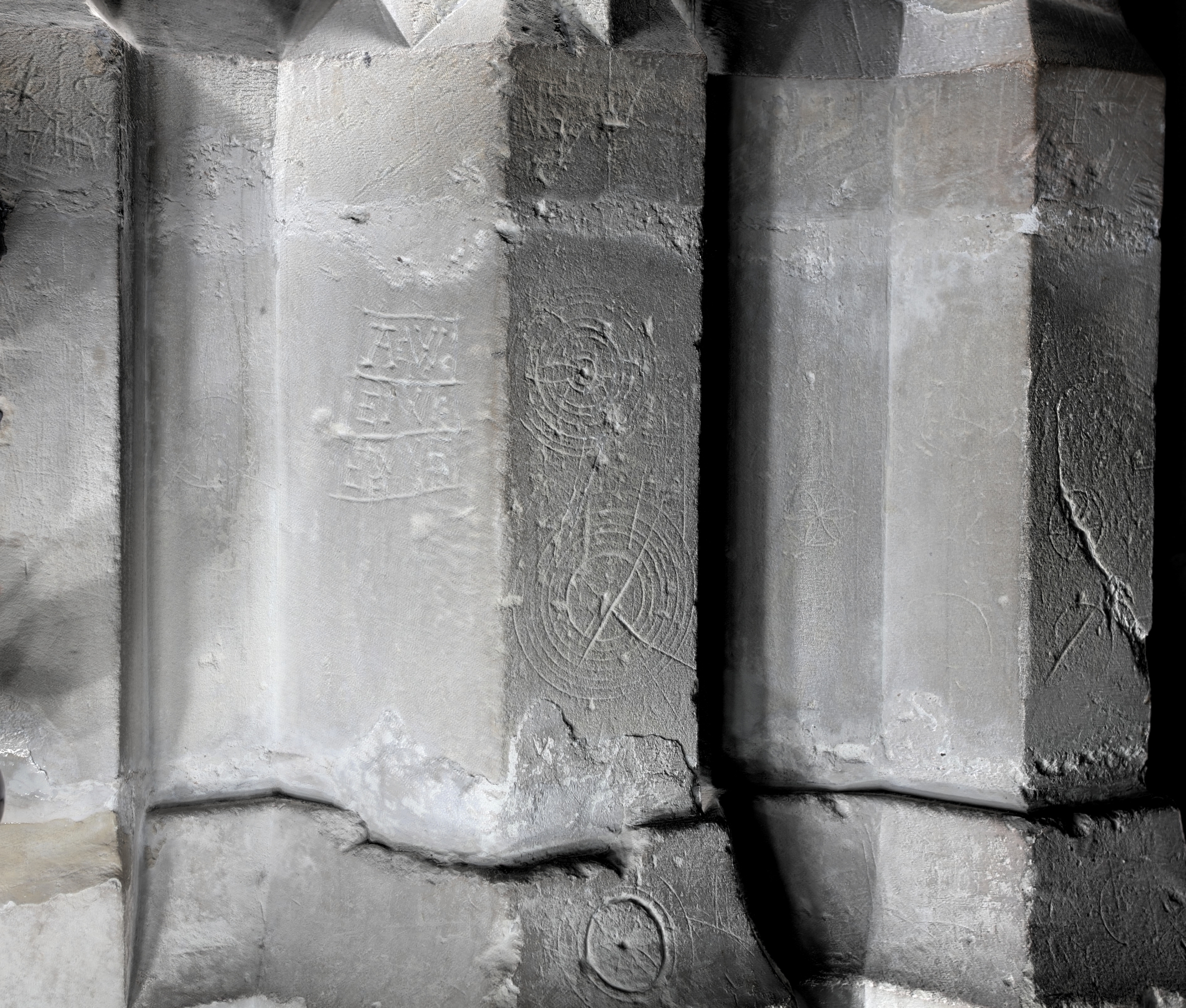 These included a range of subjects including a faint wall painting, wall memorial plaques, stone marks on column bases and historic graffiti on external wall surfaces.