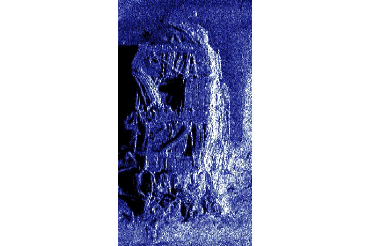 Wessex Archaeology sidescan sonar image of the South Australian wreck from a previous geophysical survey for Historic England: the mound that can be seen is the cargo of railway track.
