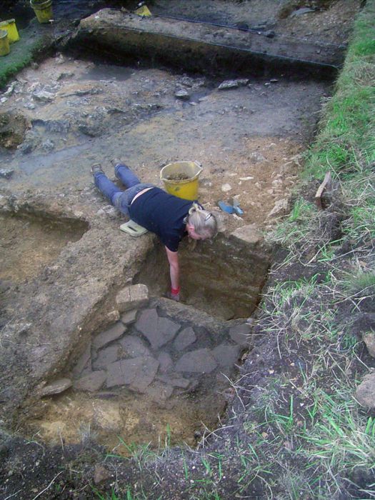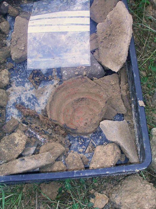 In another section of the main trench a nice collection of almost complete roof tiles have been exposed, one of them with the nail head still in place. The collection has allowed us to create a little demo roof on the side of one of our spoil heaps.
