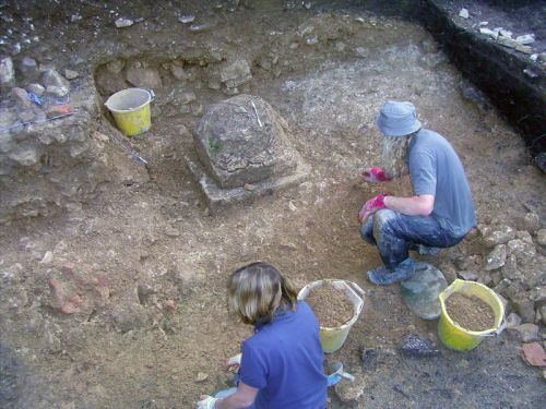 During the day a number of interesting items were recovered, including a piece of melted glass, some very nicely faced pieces of stone from a rubble pile, and the site’s first large piece of CBM (ceramic building material). The most interesting revelation of the day, however, was the completely exposed column base... which suddenly did not look so much like a column base any more. Seeing the large stone blocks exposed for the first time, the column base whose pair we have been searching for, now looks more likely to be an altar. During the next few days of excavation volunteers will continue to reveal features of the possible forecourt in this area, and now attempt to clarify the identity of the base – column or altar?
