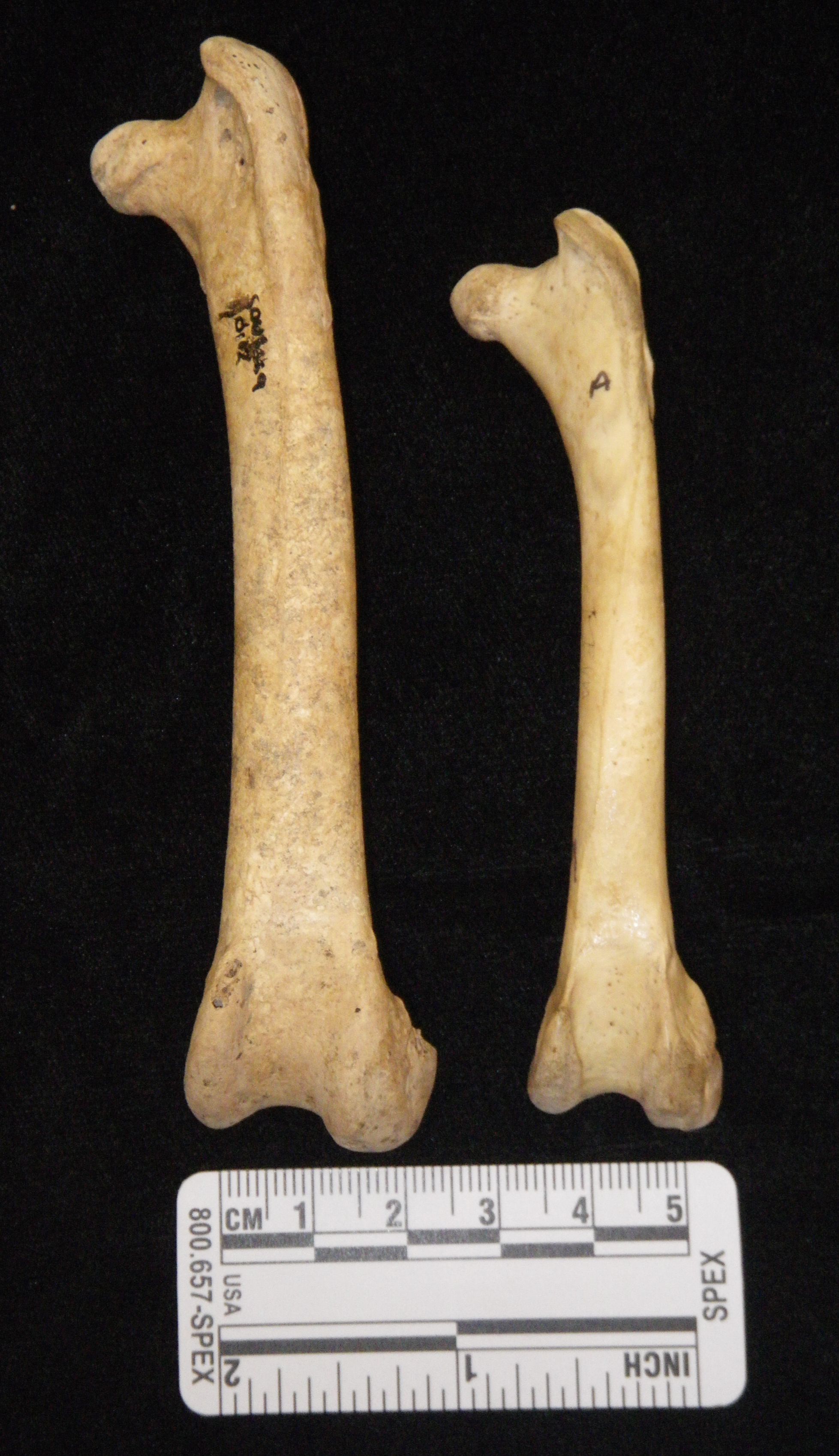 Recent excavations at the Fruit and Vegetable Market in the historic core of Southampton revealed a cluster of intercutting pits associated with a medieval and later property boundary. One of the pits contained the femur from a turkey (Meleagris gallopavo) and dates to the 17th century. Turkey bones are very like those of chicken, simply much larger as the photo demonstrates.