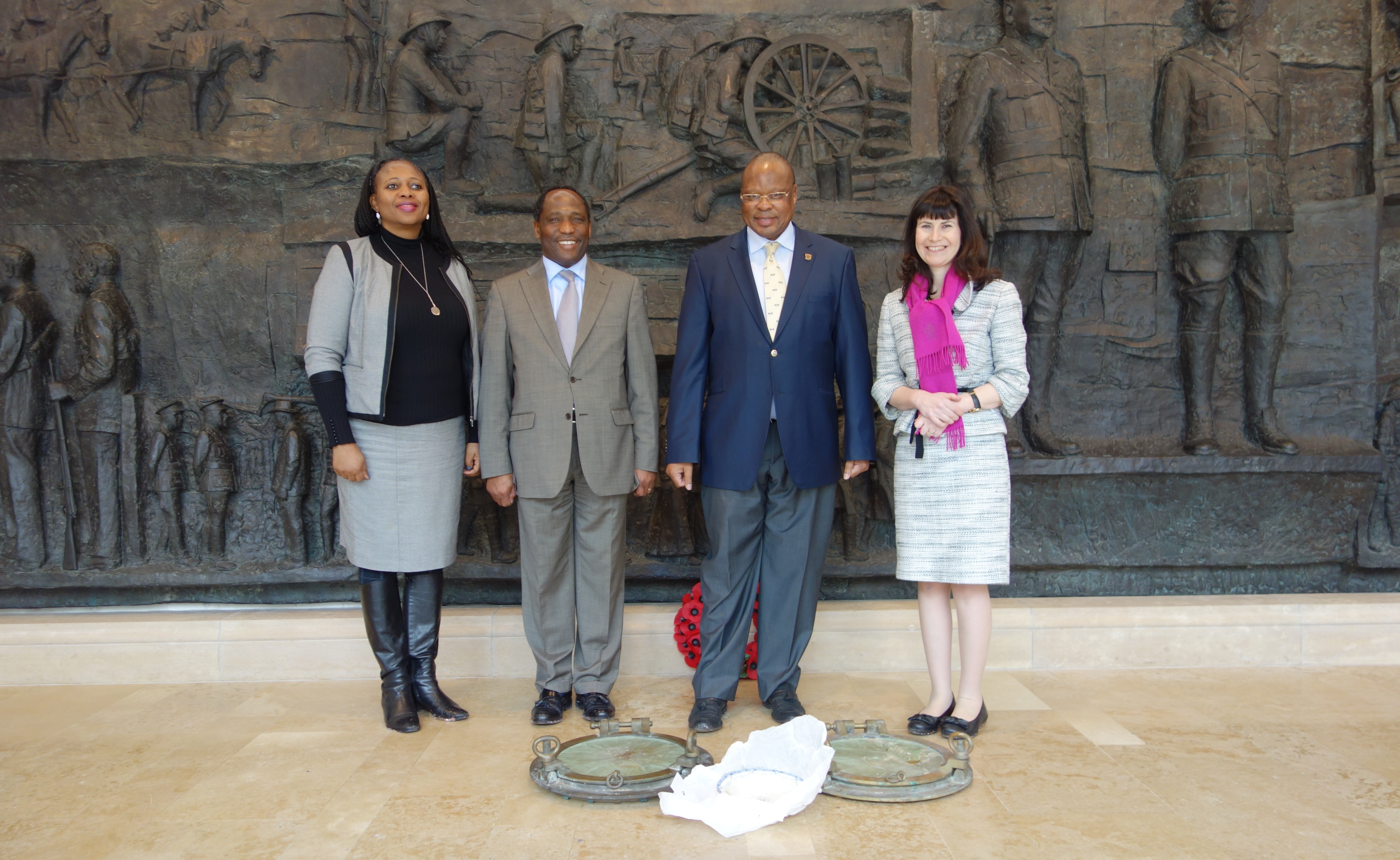 The South African National War Memorial’s forthcoming permanent exhibition on the loss of the First World War transport ship Mendi reached another milestone last Friday. UK museum director and exhibition lead Susan Hayward (far right), together with Wessex Archaeology’s Graham Scott, were at the Memorial’s museum at Delville Wood on the Somme to hand over a number of artefacts from the wreck of the Mendi to the South African Ambassador to France, His Excellency M. Rapulane Sidney Molekane (second from right).