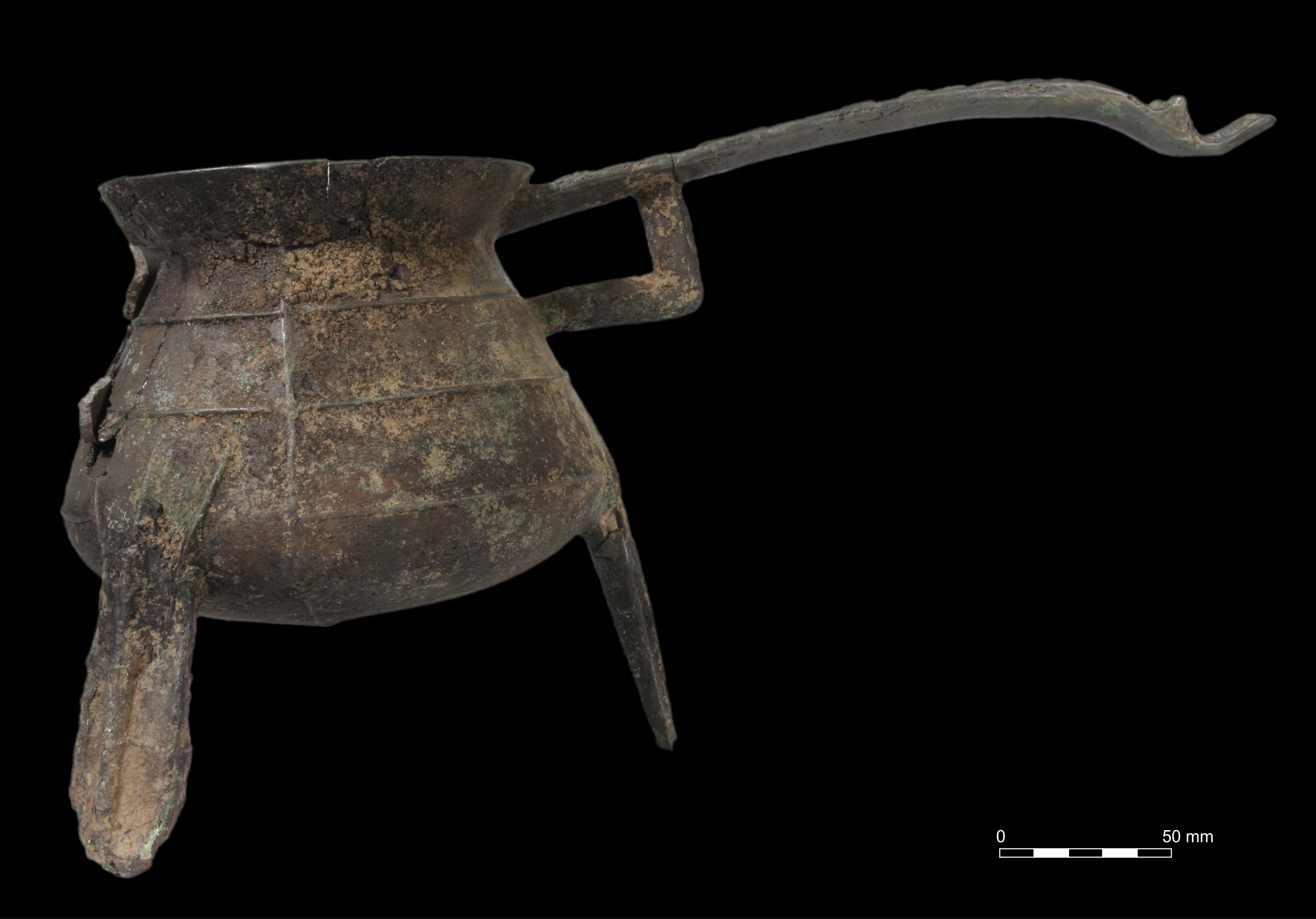 This metal cooking vessel has had a hard life. It is a cast tripod vessel with a single handle, of a type known as a ‘posnet’, more or less equivalent to a saucepan, and would have been used over an open fire on a hearth. It was found during excavations by Somerset County Council at Burtle Priory, in the heart of the Avalon Marshes in Somerset, in a layer which might be associated with demolition at the time of the Dissolution of the Monasteries under Henry VIII. This gives us a good terminus ante quem for the posnet (ie, it must date prior to the mid-16th century), but the posnet itself gives us a clue as to its date from the profile – from the beginning of the 15th century, bag-shaped vessels such as these were beginning to replace the spherical vessels of the medieval period.