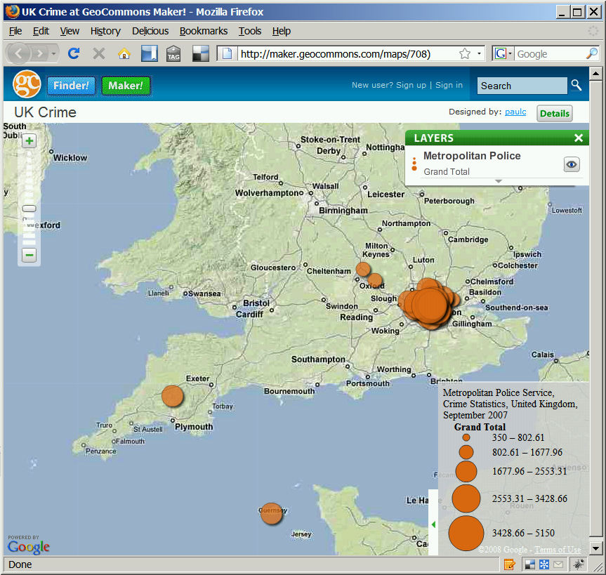 Of course, as with any such site based around user generated content, there will be some poor quality content and it will be necessary to be a bit discerning when choosing layers. I wasn't aware for example that the London borough of Brent has moved to the south-west, as indicated on the UK Crime map I produced using one of the layers from Finder. But in so far as providing a great set of tools for producing maps online quickly and easily and a very big warehouse in which we can put collections of geodata to be shared, it has to be a big well done to the folks at Geocommons.
