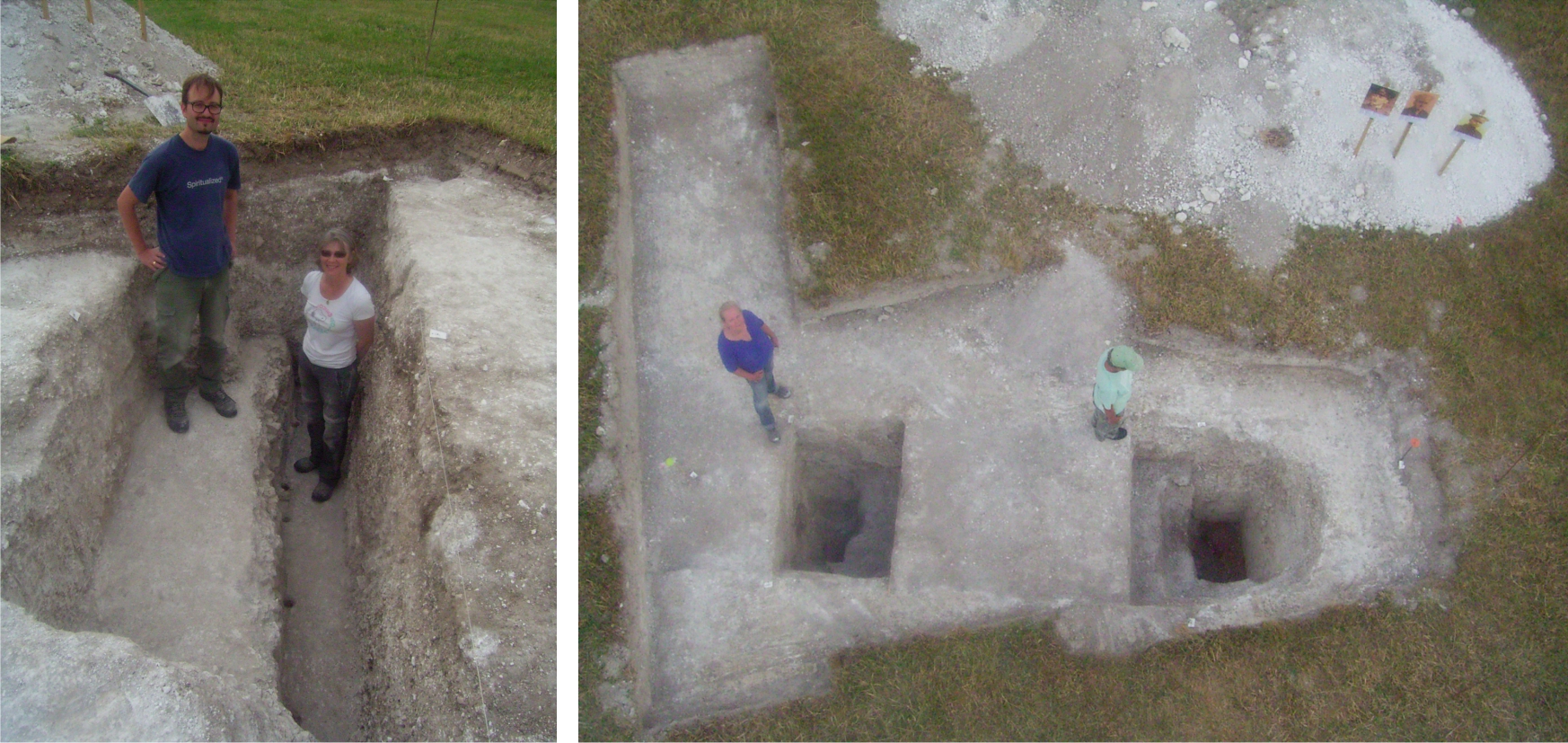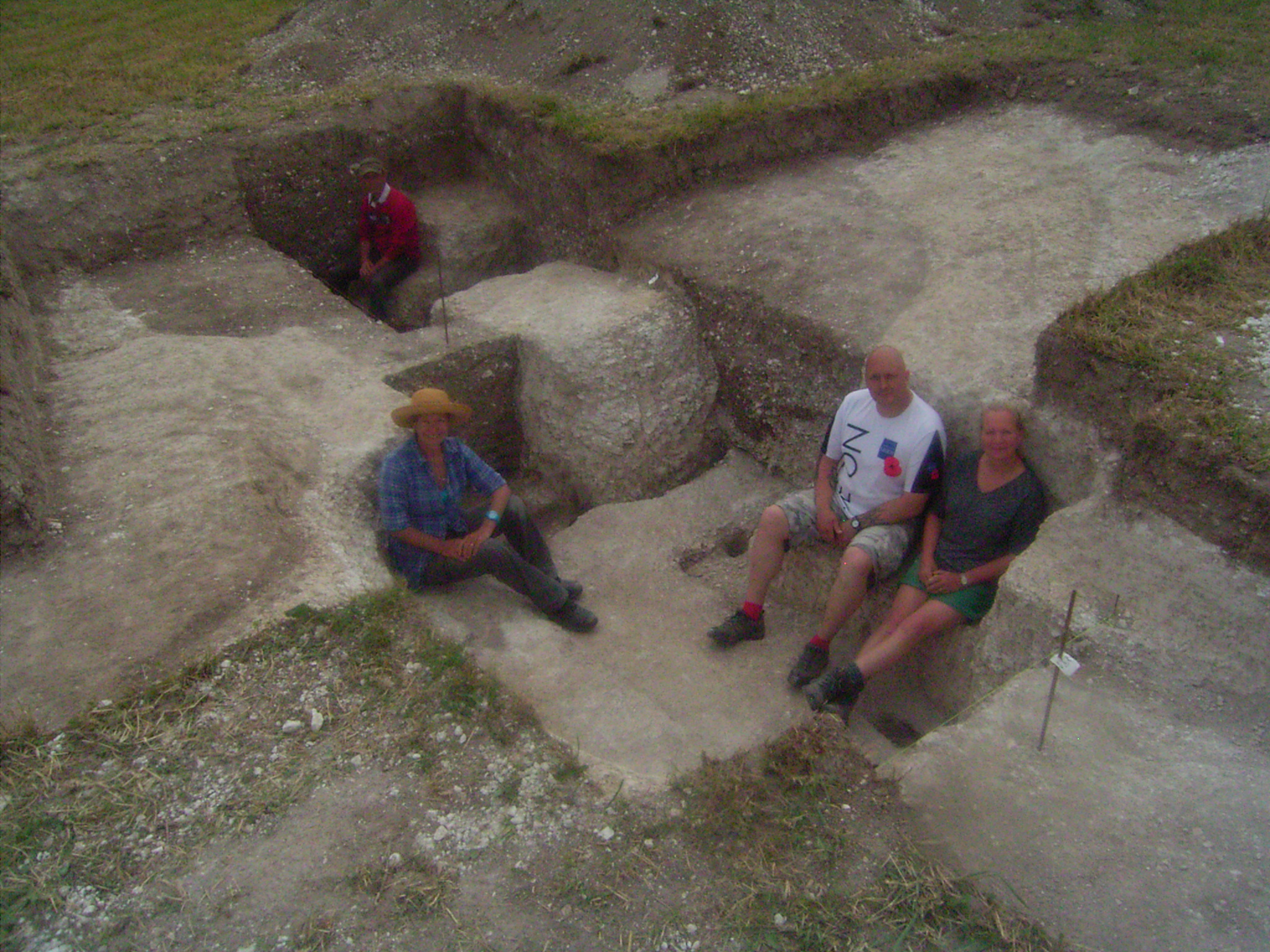 The shelters, with a communications trench running through them and a supply trench joining them from the west, contained chalk-cut benches providing seating on each side – as demonstrated here by Briony, Matt, Owen and Jayne. There were also the remains of timber posts that would have supported the roof and held the side revetting in place. In the bottom were two biscuit tins and a condensed milk tin – all empty!