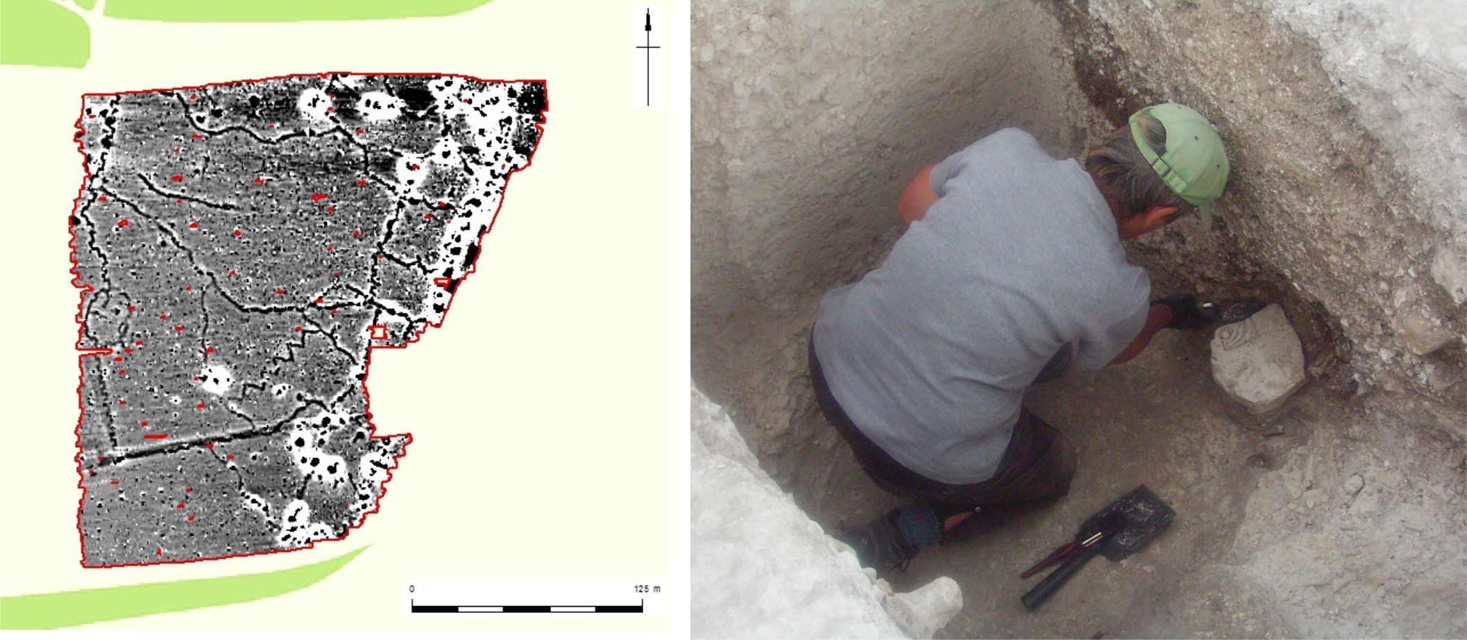 The geophysics information gathered by Jen, Becky, Rok, Ali and Nick over the first two weeks has been processed, with excellent results, illustrating very clearly the layout of the ‘German’ practice trenches in the area we are working in. The white ‘halos’ indicate metal present, much of it probably corrugated iron, particularly in the shelters. The geophysics plot shows more detail than can be made out on the aerial photographs, and also highlights several differences between the 1915 plan of the trenches and the layout that was eventually dug.
