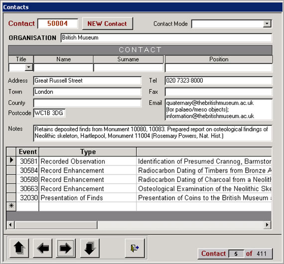 A 'contact' record is created for each institution, group or private individual that may have been associated with a monument. For example, a monument may be recorded in the NMR and/or SMR, discovered by a particular individual, excavated by an archaeological contractor and published by a certain archaeologist, while the finds may be deposited in a local museum. Recording these contact details facilitates the tracking of information and artefacts and may highlight the individuals most knowledgeable about a certain area.
