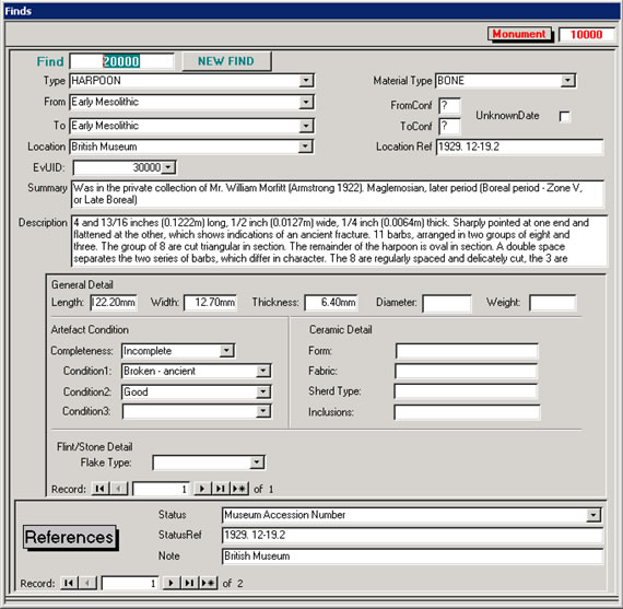 The Artefacts from the Sea database requires that a 'find' record is created for each find, or set of finds, associated with a particular monument. For example, a site containing several Mesolithic microliths would require separate finds records, for each individual artefact. The finds record form is designed to encourage the recording of a higher level of detail about artefacts than is usually found in monument-oriented databases.