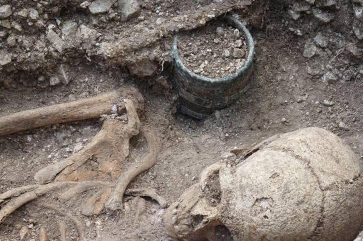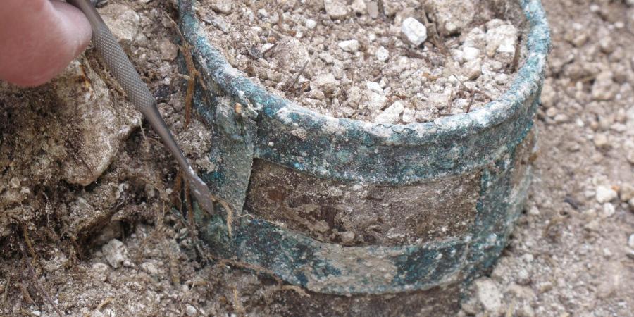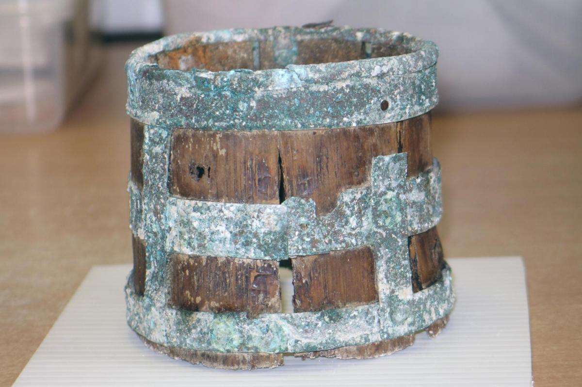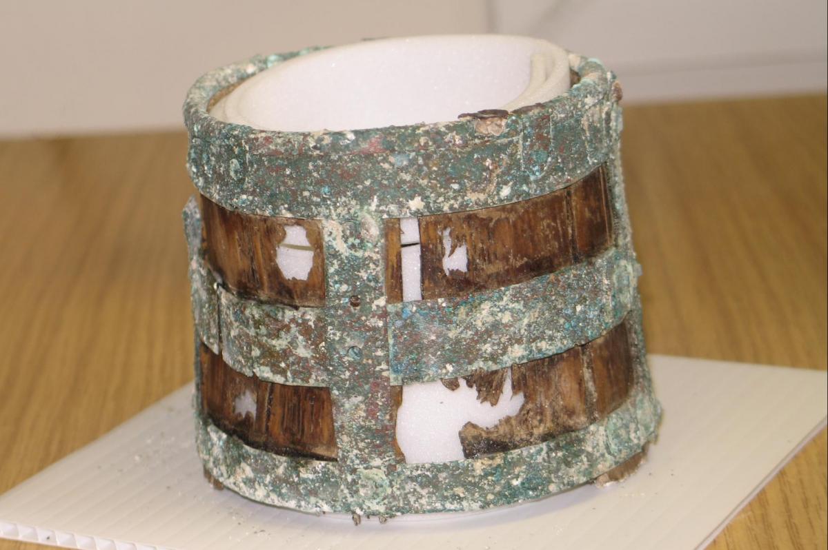 During excavations at Barrow Clump in 2012, as part of Operation Nightingale, a number of Saxon graves were excavated, containing a range of grave goods – weapons, jewellery, and other items. One of the most interesting of these objects was a small wooden bucket, which required intricate conservation work to lift, consolidate and preserve it – a real challenge to the conservator.The bucket was carefully loosened from the surrounding soil and cushioned with bandages for lifting. It is about the size of a tankard and has three decorated copper alloy bands holding the wooden staves in place. Nearly all the wood has survived, which is unusual, but the base has been lost. It is still possible to see part of the groove along the bottom of some of the staves where the base would have fitted. Strips of decorated copper alloy, fixed with rivets, run vertically down the bucket and hold the bands in place.
