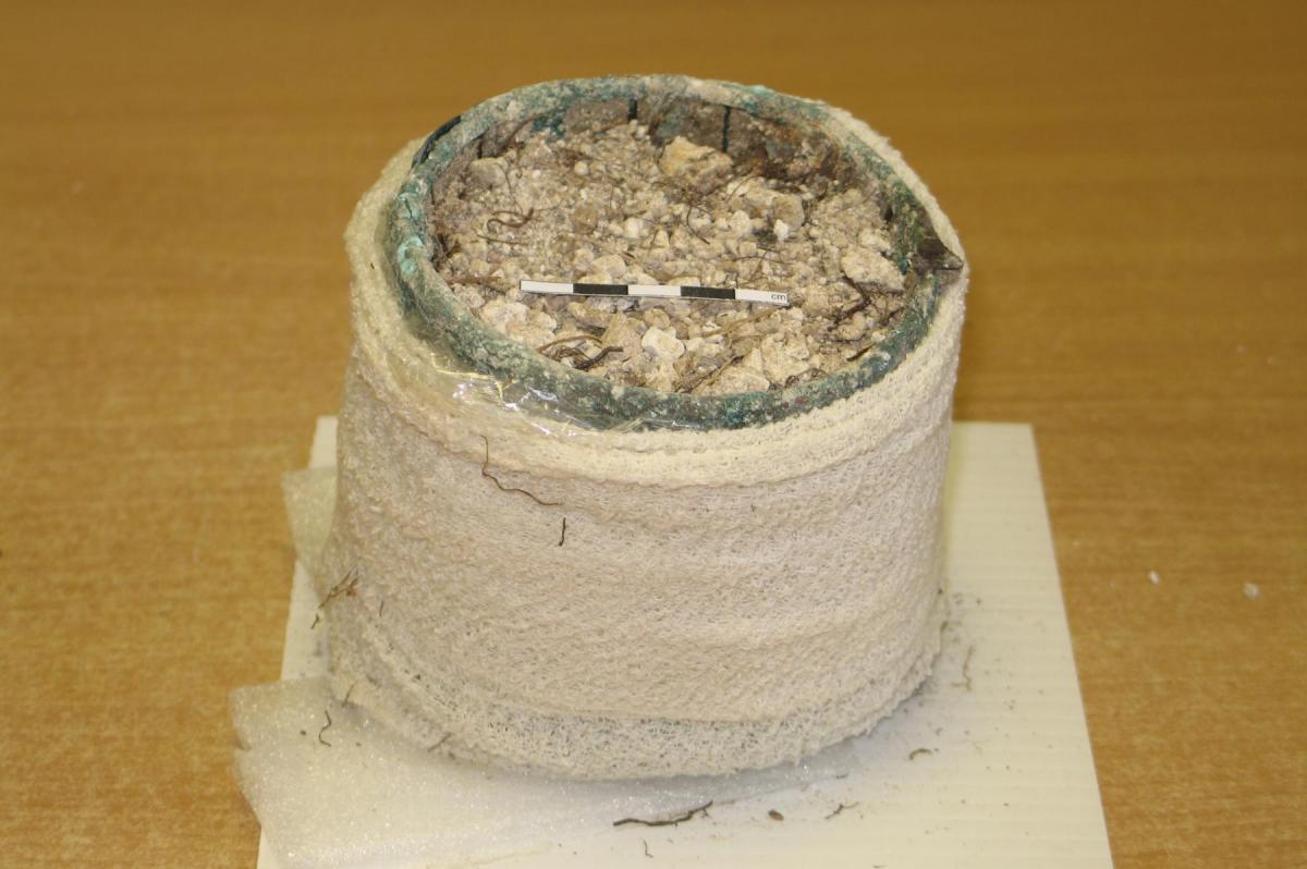 The bucket was lifted with its contents still inside, as this reduced the risk of collapse. However, the chalk inside the bucket acted as a poultice and made the bucket so damp that the copper alloy bands started to corrode. The contents had to be removed straight away and were retained for future investigation. A light spring was put inside the bucket to reduce the chances of it collapsing in on itself.