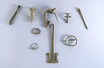 All are made of copper alloy. The brooches (2, 3, 4 & 9) are all of 1st century AD date while items such as the tweezers (1), hair pins (5) and finger rings (6 & 7) were used throughout the Roman period.
