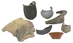 5&6 were probably storage vessels for dry goods such as flour or pulses although 5 may also have been used over a fire as a saucepan. 3&7 were also cooking vessels. Vessels of this type may have been used together, the shallow dish (7) being inverted and used as a lid over the deeper bowl (3) as a casserole. (4) is of slightly higher quality and represents a medium-quality vessel between the range of coarse cooking/storage pots and the fine table-wares such as (1).