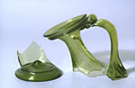 Pieces from one of five complete glass vessels (this jug, 3 cylindrical bottles and 1 hexagonal bottle) found inside a very large pottery jar at Lower Cambourne Green. The glass and pottery are all of a very late 3rd or 4th century date.
