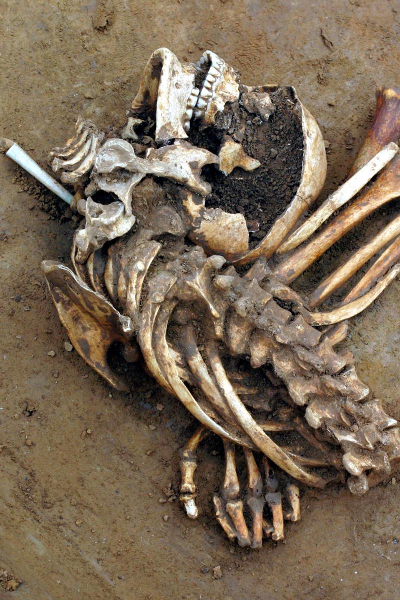 A later prehistoric midden pit and an enigmatic large mortuary feature in use during the Bronze Age and Iron Age, which contained an extraordinary series of deposits of human remains (complete in situ burials, placed groups of articulated bones, as well as disarticulated remains), accompanied by complete or near-complete carcasses of animals (lambs, horse, cattle), and some placed artefacts.