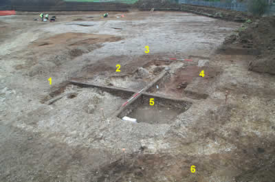 KEY: 1 Entrance, 2 Chalk wall, 3 Hearth, 4 Oven, 5 Occupation layer, 6 Enclosure ditch