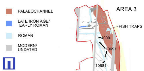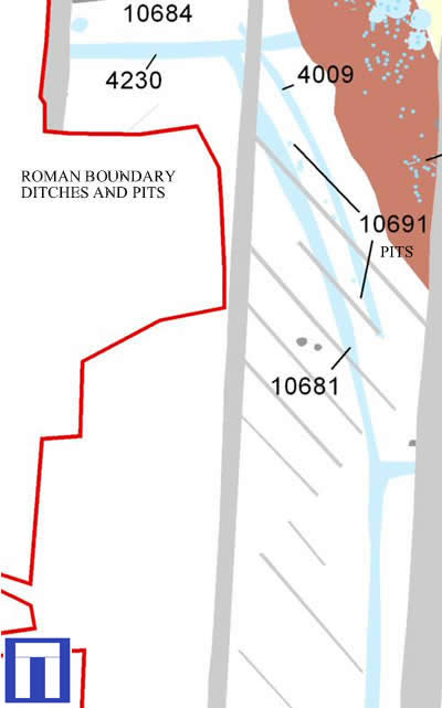 Whilst this period of history is described as Roman we must always remember that although the Romans did invade, life for most people carried on in much the same way as before. Most of the features were ditches for drainage, land division and stock control. The plan (left) shows just such uses with ditch (10681), which was used as a boundary and for drainage. Then to the east of this are 7 post-pits (10691) and another ditch (4009) that may have been a fence for stock control.