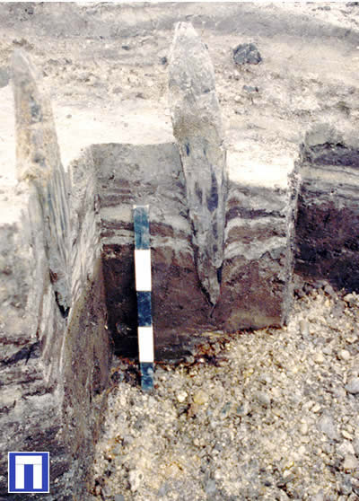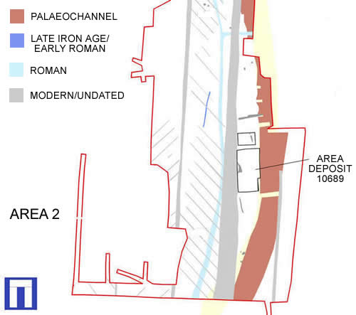 This area of excavation contained a range of archaeological remains. The fact that some of the features occurred within the palaeochannel is of great interest. These features probably represent timber revetments to minimise erosion of the channel bank. The structures were made of thick well-worked timber stakes, several of which partially survive, forming several phases of revetment. They were positioned at a point within the channel where water erosion would be greatest. The exact date of these is unkown but they are believed to be Roman. However samples will be sent for Radiocarbon dating to confirm this (see overview).