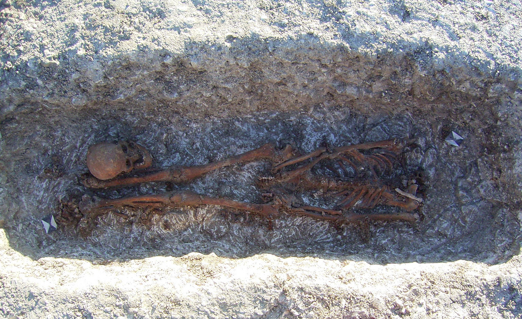 The cemetery at Little Keep is unusual due to the high frequency of ‘deviant’ burial rites. A high percentage of bodies had been buried prone (face-down), whilst several others had been decapitated, the head being placed by the legs. The evidence suggests that an ageing population made use of this area for burials, reflected in the relatively high rates of degenerative joint diseases and lack of immature individuals. There was a higher proportion of males, with a number showing signs of traumatic injury including evidence for interpersonal violence.