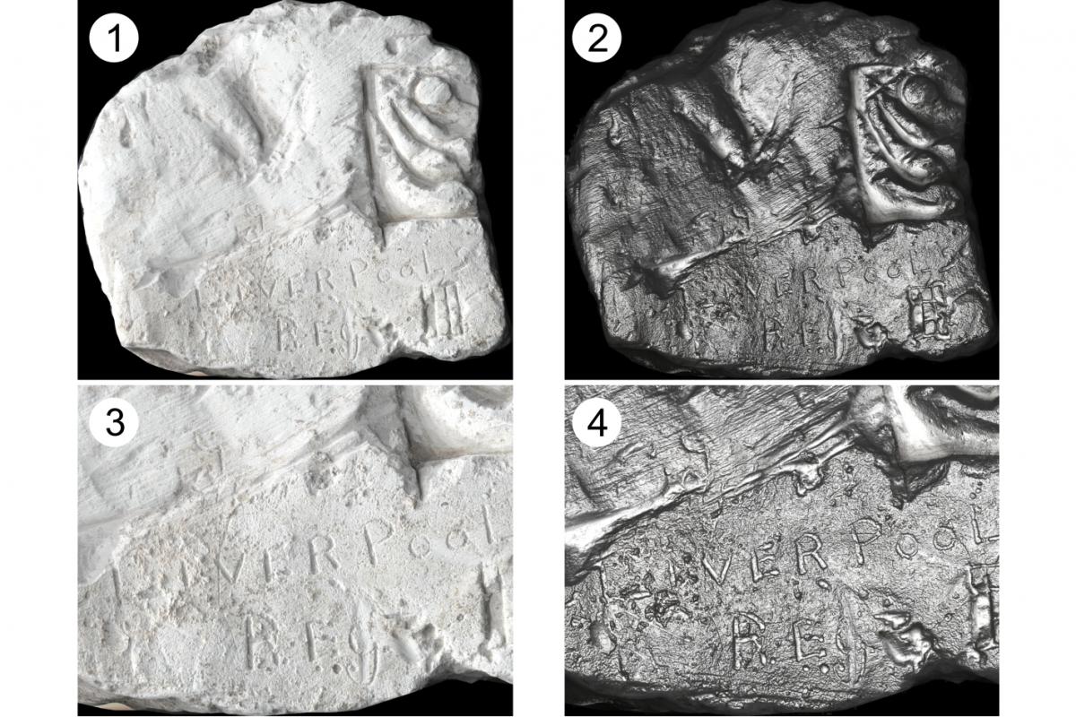 The first image (image 1) is viewed with the default setting. Here can clearly be seen ‘Liverpool Reg’ inscription along the bottom and the unusual carving, in a part square border, to the top right. When viewed in specular enhancement (image 2), the significant reflective qualities of chalk become apparent and highlight well the surface detail. What appear to be a set of diagonal cuts in the surface of the chalk at top centre, and at first thought to be damage, can also be seen to be deliberately incised into the chalk. When viewed in close-up and in default setting (image 3), a study of the style of the visible lettering ‘Liverpool reg’ revealed a ‘copper plate’ style specifically to the letter ‘g’ in ‘reg’. When the damaged area above ‘Liverpool’ was studied in close-up and in specular enhancement (image 4), the remains of a letter ‘g’, in a similar style to that in ‘reg’ can be seen. Other letters had been abraded away leaving only the letter ‘g’. Subsequent research into the regiments of Liverpool during the First World War identified The Kings Liverpool Regiment as likely candidates for the carving.