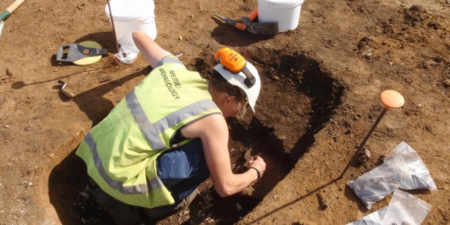 The excavations found very little evidence for Late Bronze Age activity, but by the Early/Middle Iron Age an open settlement had been established, represented by a single roundhouse with an adjacent square post-built granary-type structure, and several relatively shallow pits, some of which were for storage. A single neonate burial dated to this period. By the end of the Middle Iron Age part of the settlement area had been bounded by small enclosure ditches, the larger D-shaped enclosure, with a west-facing entrance, to the west, and a smaller sub-square enclosure to the east, and with a possible trackway running along their northern sides.