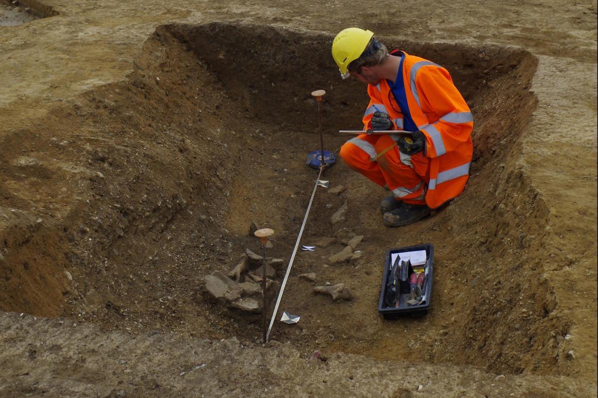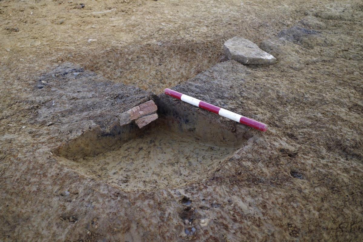 There is little evidence for Romano-British activity in the local area but it is likely that the site played a role in the rural economy of the wider area. Earlier evaluation work identified two Romano-British features towards the southern edge of the quarry. Excavations in 2016 produced evidence for a probable Romano-British field system, which may have been linked to a farmstead thought to lie to the north-west of the quarry. Romano-British finds increased towards the north-western edge of the quarry and included an oven that contained quernstones in its backfill and a number of field ditches and pits. Roman pottery and roofing tiles were found in the ditches and animals had been buried in the top of one of the ditches.