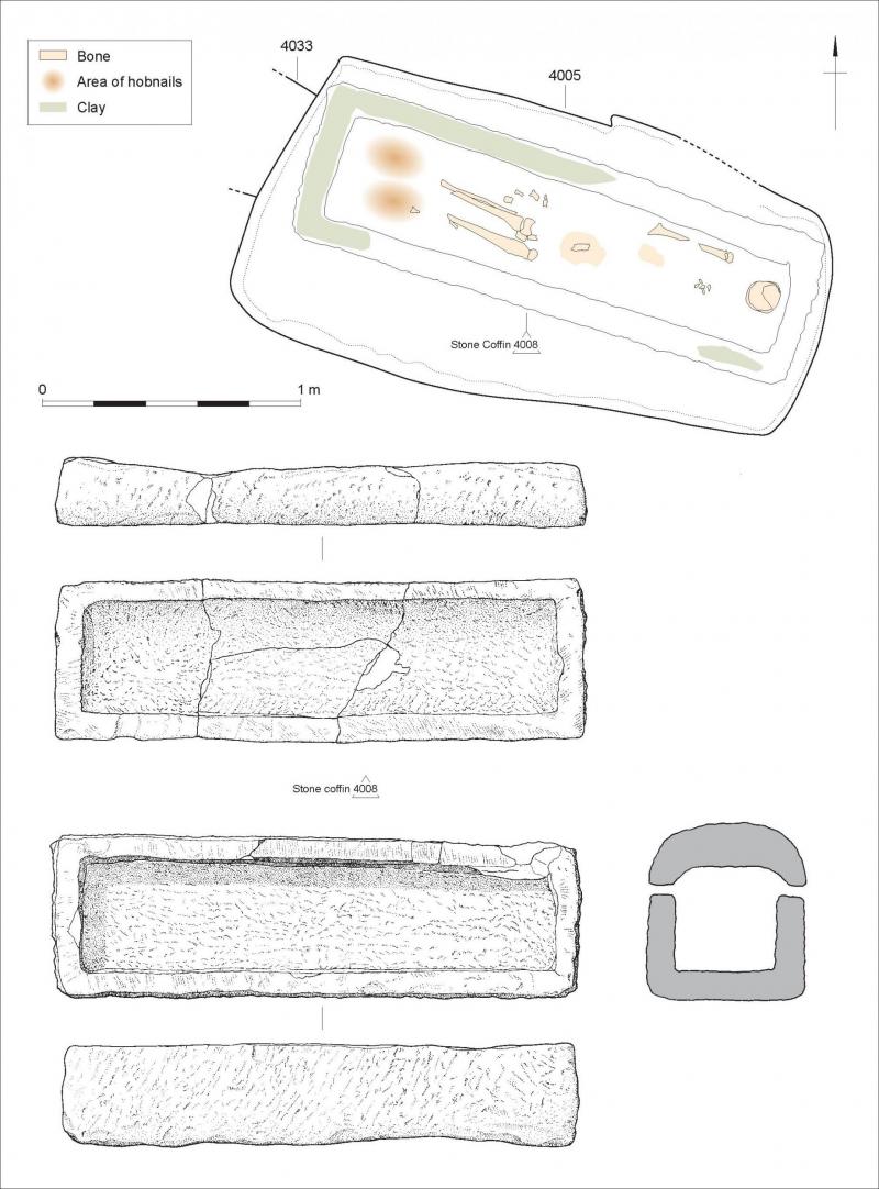 The coffin was found in one of nine excavation areas totalling three hectares. It is the only burial so far excavated in that area but a further six or more features scattered across the area are thought likely to prove to be Roman burials when excavated. A further ninefeatures thought to be graves have been identified in the adjacent Area 4. A small square enclosure in this area may represent a garden of remembrance.