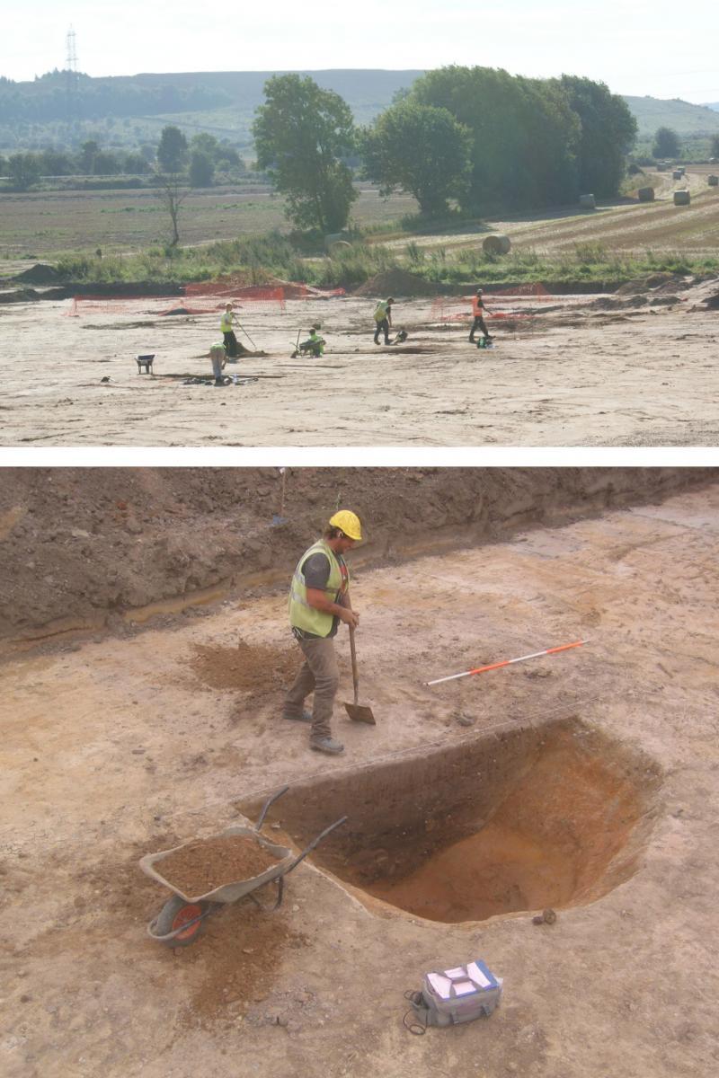 The work identified a small sub-square enclosure connected to field system ditches, and four adjacent waterholes, with the site producing a small assemblage of finds including Romano-British pottery and a cremation burial. The enclosure and associated ditches were integral parts of an extensive field system visible as cropmarks in the surrounding landscape, and confirmed by the results of the geophysical survey.