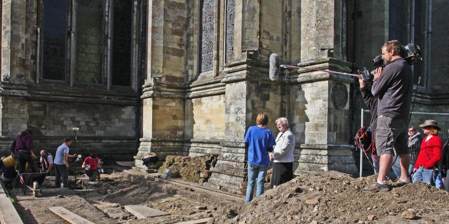 An archaeological evaluation was undertaken by Channel 4’s ‘Time Team’ within the Close of Salisbury Cathedral and the grounds of Salisbury Cathedral School, Wiltshire to investigate the 13th century Bell Tower to the north of the Cathedral and the 15th century Chantry Chapel of Bishop Richard Beauchamp, both of which were demolished at the end of the 18th century. No archaeological investigation of the Bell Tower had been undertaken before, although the Chantry Chapel had been investigated on two previous occasions, by Tim Tatton-Brown (Salisbury Cathedral Consultant Archaeologist) and the Chapter workmen in 1992 and by Cambrian Archaeological Projects Ltd in 2000. The 2000 evaluation revealed the extent of the chapel foundations and an in situ inhumation burial, first identified in 1992 and believed to be that of Bishop Beauchamp himself. Investigation into the Chantry Chapel revealed possible evidence of the preparation of the ground prior to the building of the Cathedral in 1220 in the form of a large chalk raft, laid down to create a dry working platform and to stabilise the ground, and possible evidence of an earlier cemetery of 1219. The buttresses of the 1220 construction were revealed and were clearly disturbed by the construction of the Beauchamp Chapel. The base of the walls of the Chapel and four burials associated with the 15th century construction were exposed. The empty graves of Bishop Beauchamp and John Cheney, whose tombs had been moved inside the Cathedral when the chapel was demolished, were identified, as was a grave possibly belonging to the Bishop’s brother William. The fourth grave (previously believed to be that of Bishop Beauchamp) was investigated although the identity of the individual remains unknown. The Bell Tower investigation revealed evidence for the early 13th century workshops or dwellings of the Cathedral workmen sealed beneath ground preparation deposits of the Tower. The Tower itself had been extensively demolished with no evidence of the worked stone facing of the walls remaining. Evidence of its later use as an inn was identified.