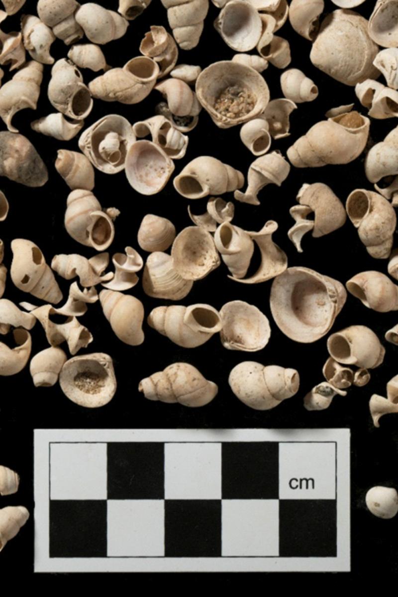 Left: Nile Mollusc shells from Trench 3 (a small sample). Image courtesy of Dr Kathryn Howley (NYU)
