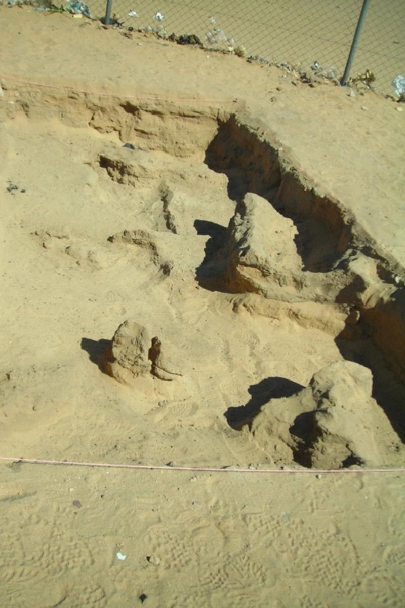 The results of our trial trenches were quite exciting. A ‘demolition’ type layer was identified as being ubiquitously present, to varying extents, across the wider site, which seemed to relate to the partial destruction of the temple or surrounding buildings (large sandstone fragments concordant with the temple fabric). This was located c. 0.3−0.5 m below the modern ground surface and comprised a mix of large sandstone, with occasional limestone blocks. Below this were layers of compacted sand, sandwiched between windblown sand to varying depths, with fragments of residual, abraded ceramics within the upper strata.