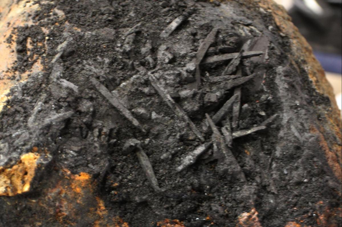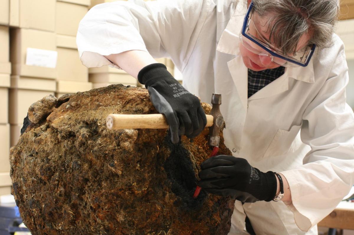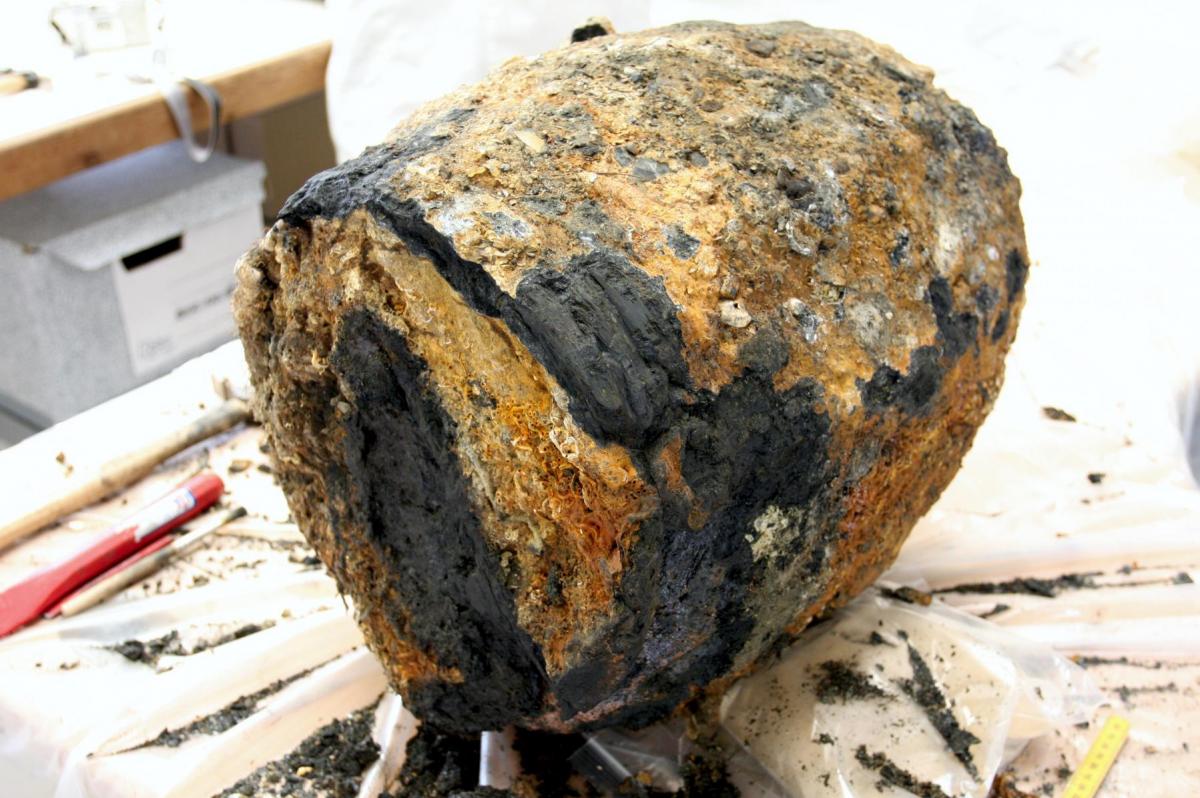 The barrel had accumulated a layer of concretion that helped preserve both the barrel and its contents. Once lifted from the sea bed, the barrel was kept wet until it could be investigated.