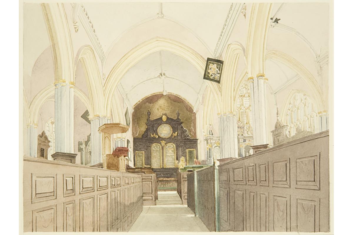 Above: Nave and chancel of St Peter's, by J. Johnson, 1828, Reproduced with permission of Bristol Museum and Art Gallery (ref. M2670)