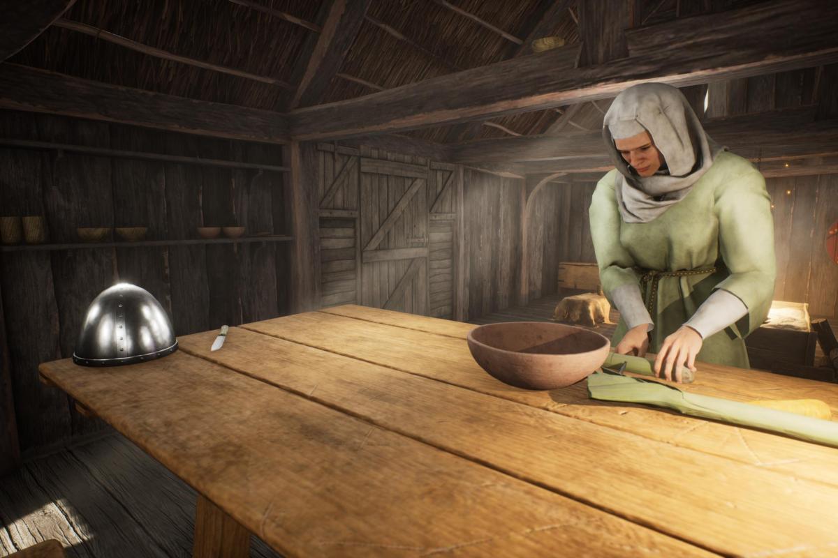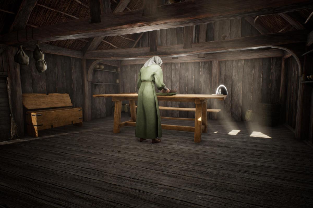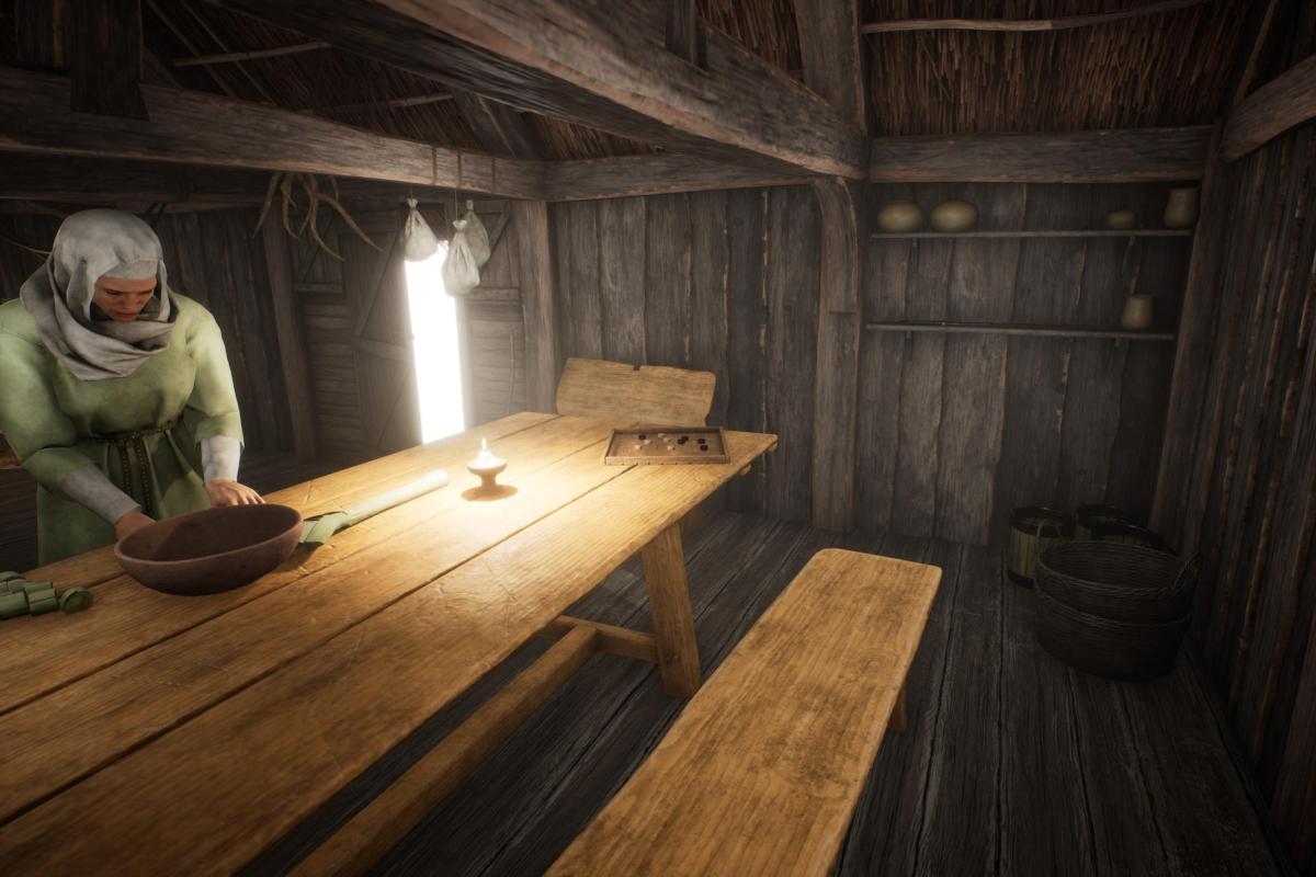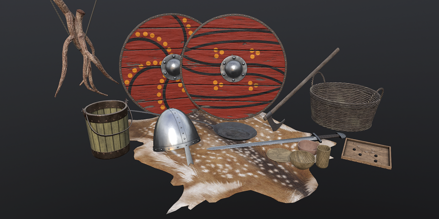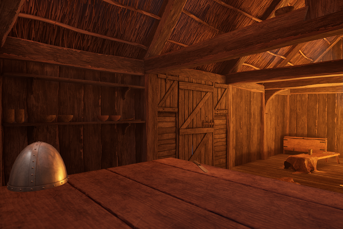 Although not a true game this experience is based on the latest gaming engine technology with added sound and autoexposure lighting to produce a highly realistic fully immersive experience. All models and textures have been created by our in-house Studio creatives and are based on research of real Late Saxon archaeological examples. Sadly the table has already been damaged, as someone has used the knife to score a message onto it!