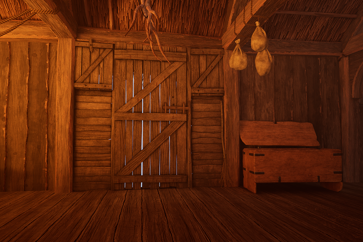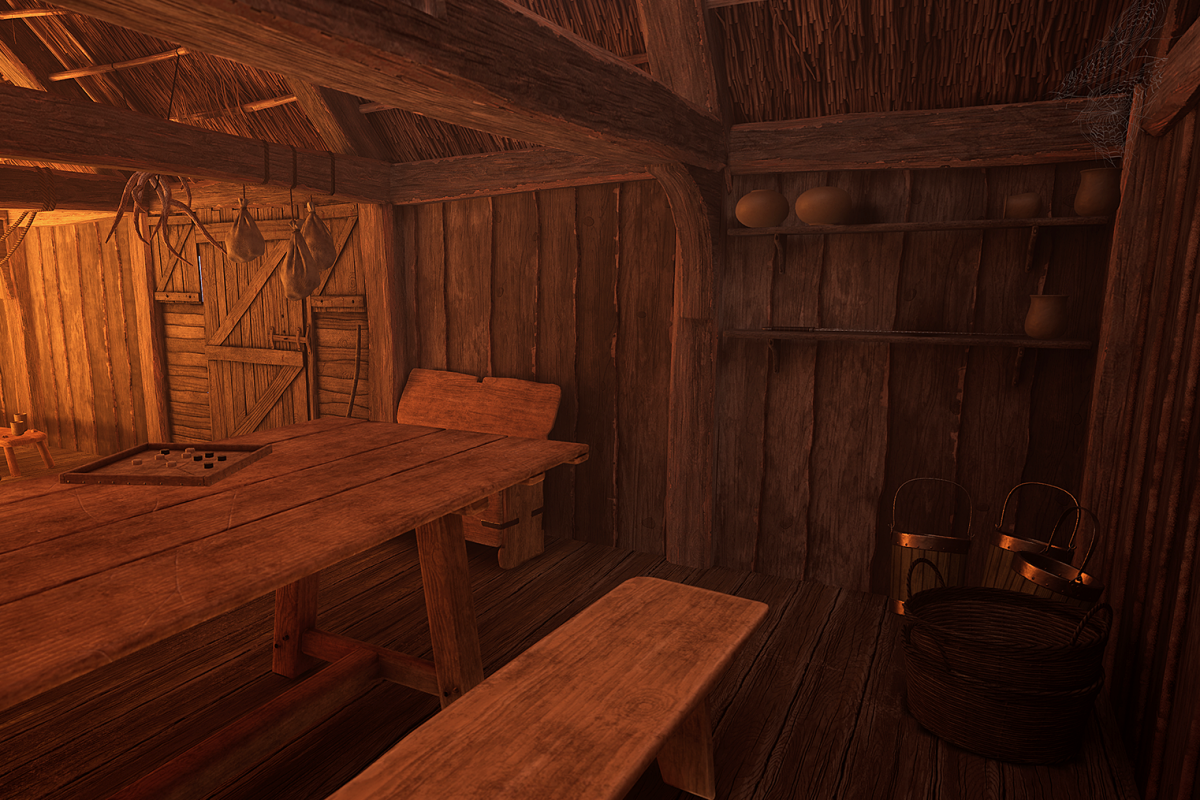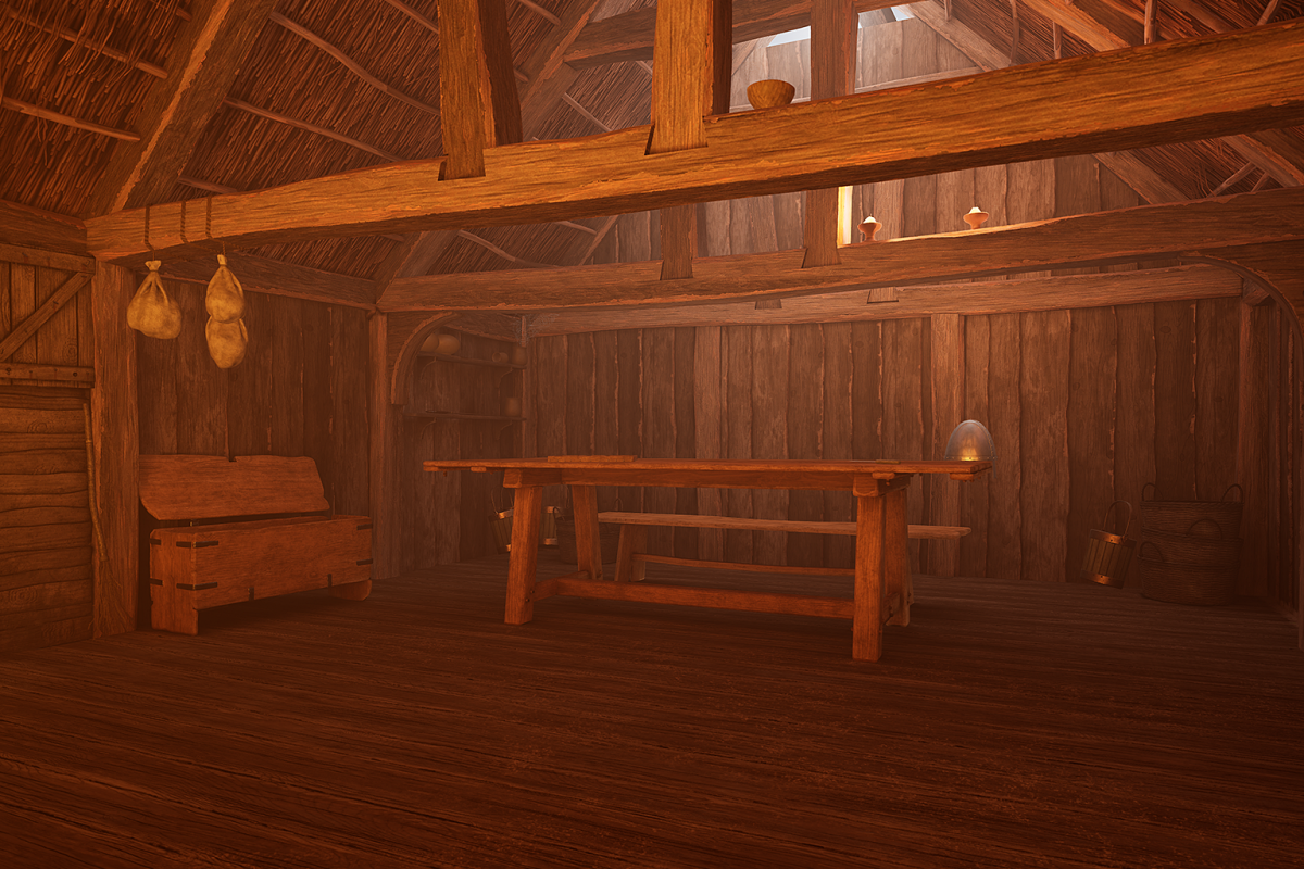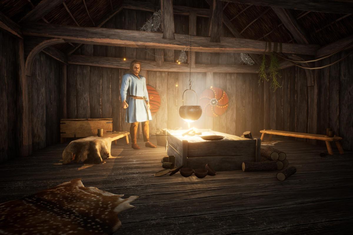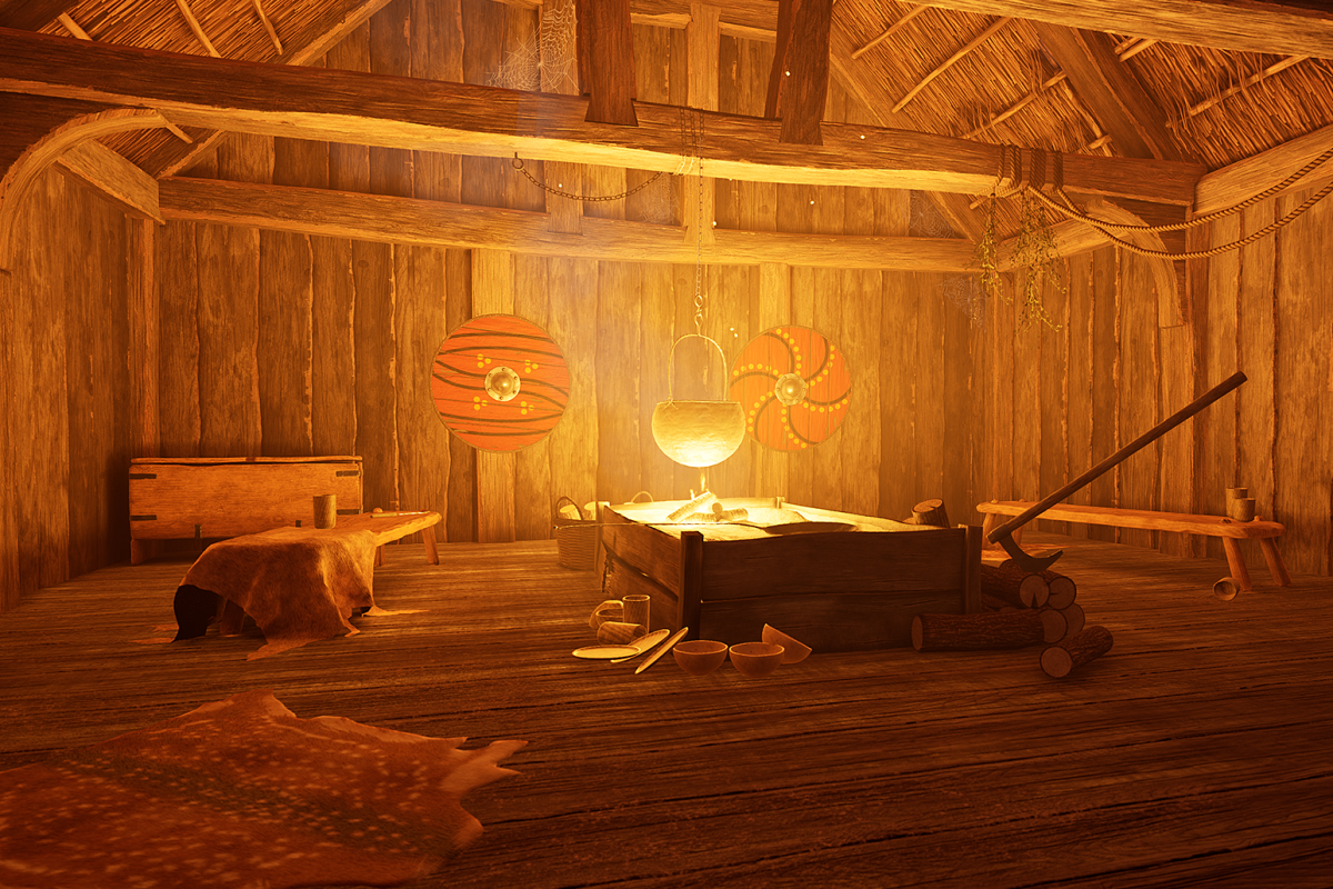 In the Late Saxon period, the buildings were very cosy or hygge. This room is made of timber with a thatch roof, it has worn oak floorboards and wooden furniture. The space is warmly lit by a cosy fire with a cooking pot that swings above it. There are animal skins on the floor and objects you can pick up and handle, from tableware to swords and shields!