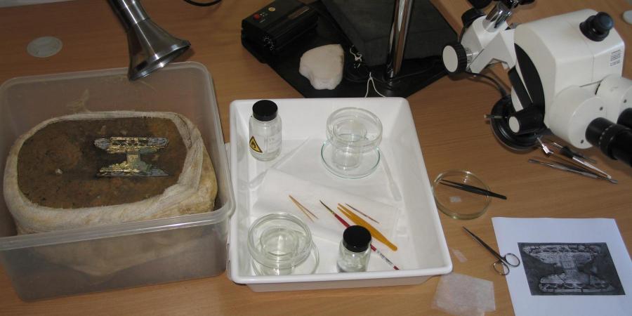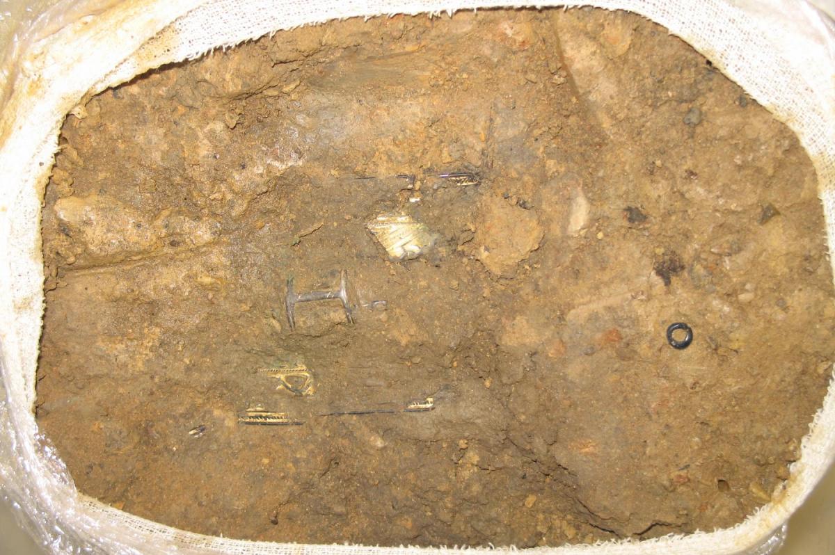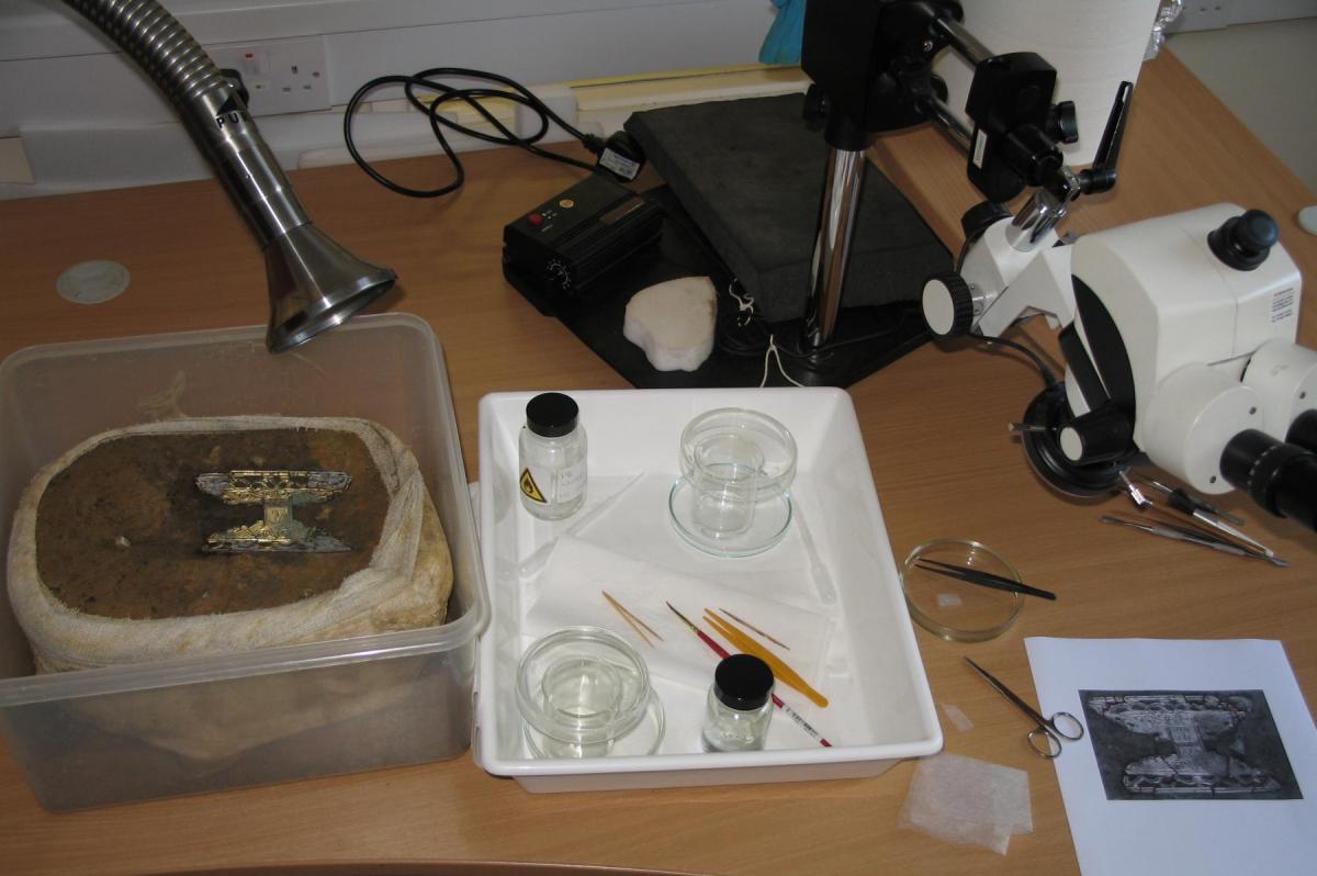 Before the brooch could be lifted from the soil block, small patches of gossamer were attached to the front to hold the brooch together. The patches were fixed across the breaks using an adhesive that would hold in the damp soil and that could be removed later without disturbing the patches that would eventually be attached to the back.