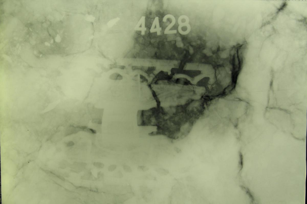 Wessex Archaeology has a long-standing involvement with Channel 4’s Time Team, providing on-site support and ‘back-stage’ expertise. In 2011, during Time Team’s excavations at West Langton in Leicestershire, a metal brooch was found in an Anglo-Saxon grave. Because of the fragility of the object, it was lifted in a block of soil along with some associated glass beads, and brought back to the WA offices in Salisbury for controlled excavation and treatment by our conservator. At this stage the brooch was barely visible, but an X-ray of the soil block revealed its shape and the fact that it was very fragmented. It also showed a hole (the dark area) in the soil block underneath the brooch.