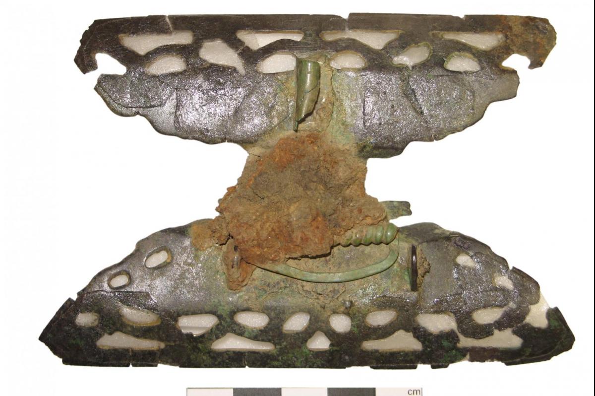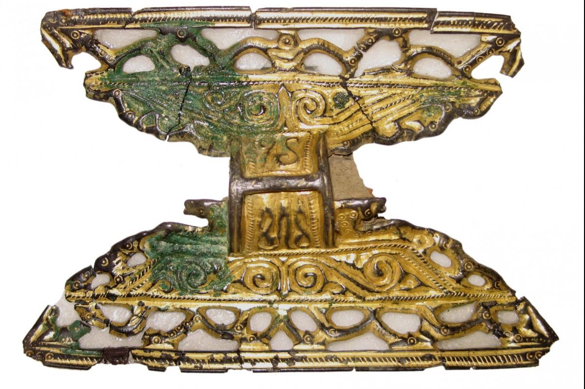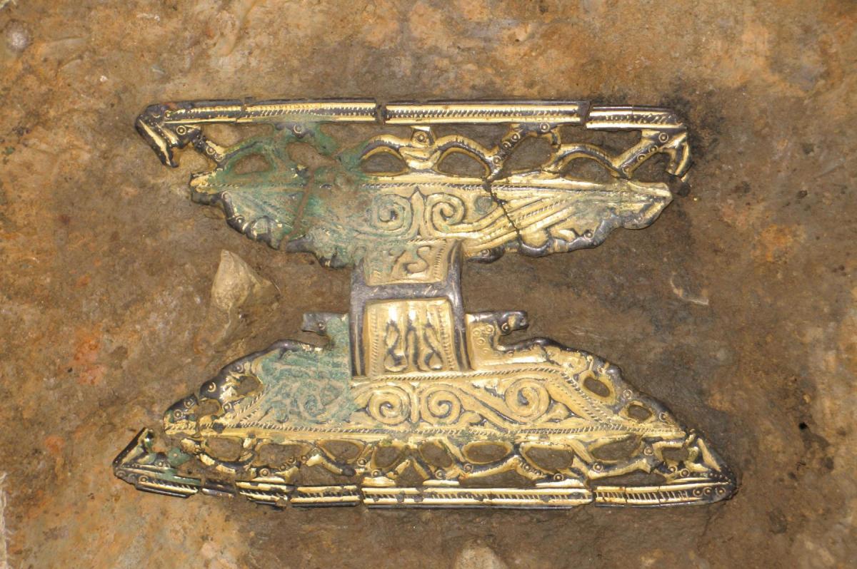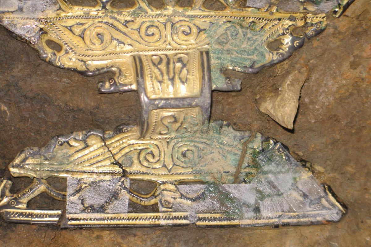 Using the information from the X-ray as a guide, the brooch was carefully excavated and found to be in 17 pieces. It is made of copper alloy and the front surface is gilded. The gold has been rubbed away from the raised areas of pattern, suggesting that it was well worn before burial.