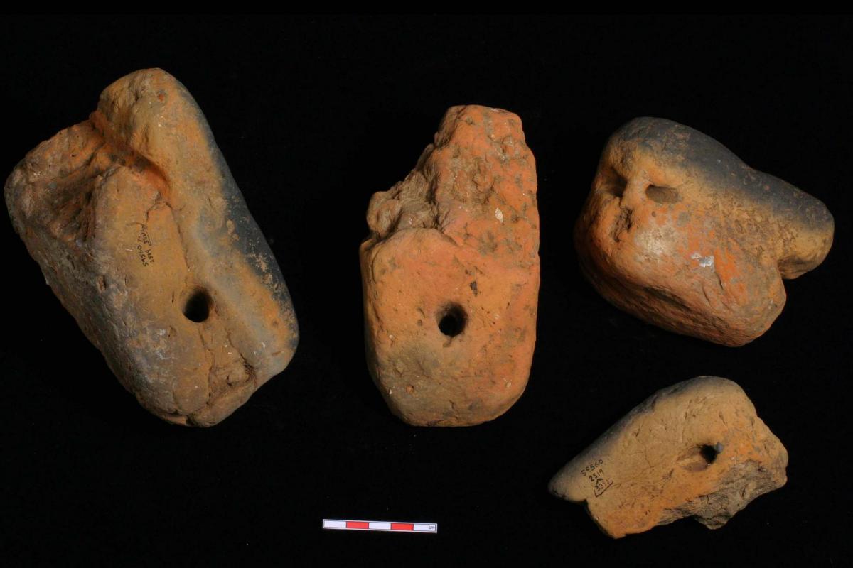 A large number of fired clay loomweights and a bone spindle whorl were found, showing that textiles were produced on the site.