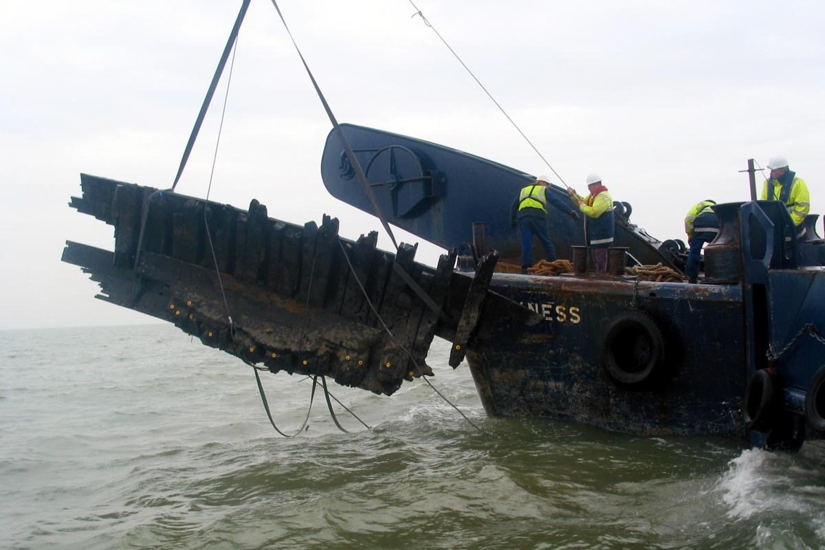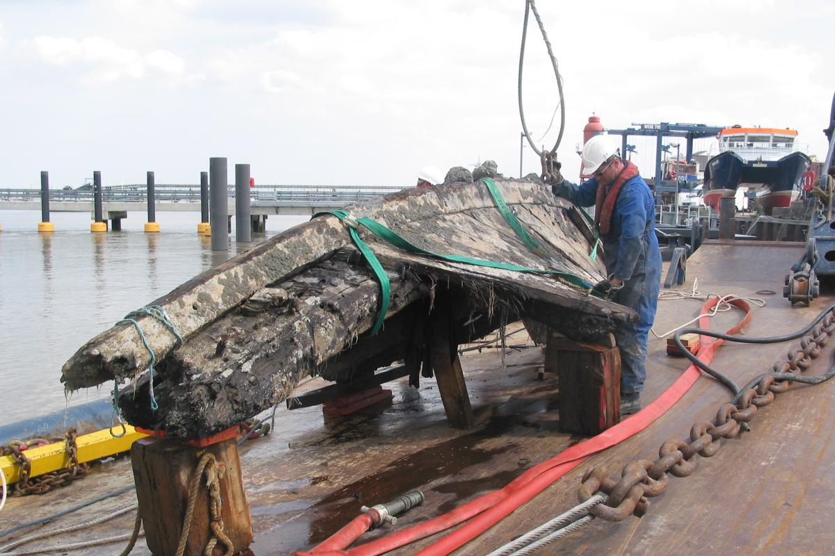 Over the summer of 2004, the Port of London Authority worked with Wessex Archaeology to excavate and recover the bow and part of the side of a late 16th century merchant ship. The shipwreck was first located in April 2003 when the Port of London Authority was undertaking survey work in advance of dredging to deepen the Princes Channel to allow safe passage for the increasingly large ships using the Port.