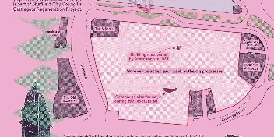 During each week of the Sheffield Castle excavation, a new site poster is created. Evoking the creative "Sheffield Makers" vibe of the vibrant Castlegate art scene, the site posters have a screen printed style and bold, limited colour palette.