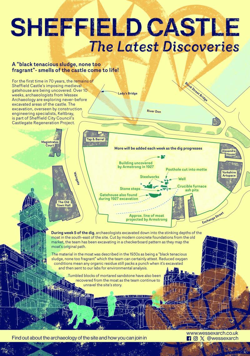 During each week of the Sheffield Castle excavation, a new site poster is created. Evoking the creative "Sheffield Makers" vibe of the vibrant Castlegate art scene, the site posters have a screen printed style and bold, limited colour palette.
