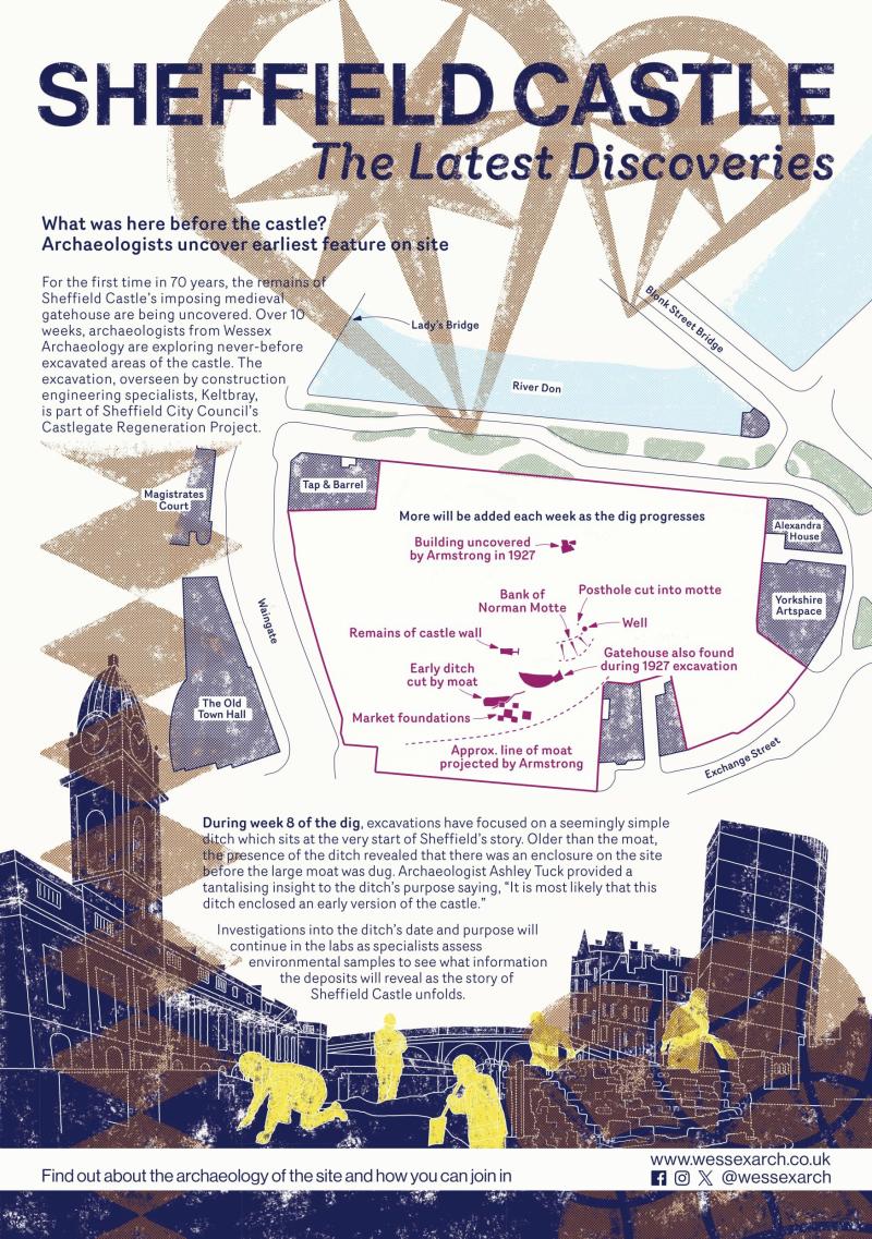 Sheffield Castle site poster week 8 pink text and images from weekly discoveries