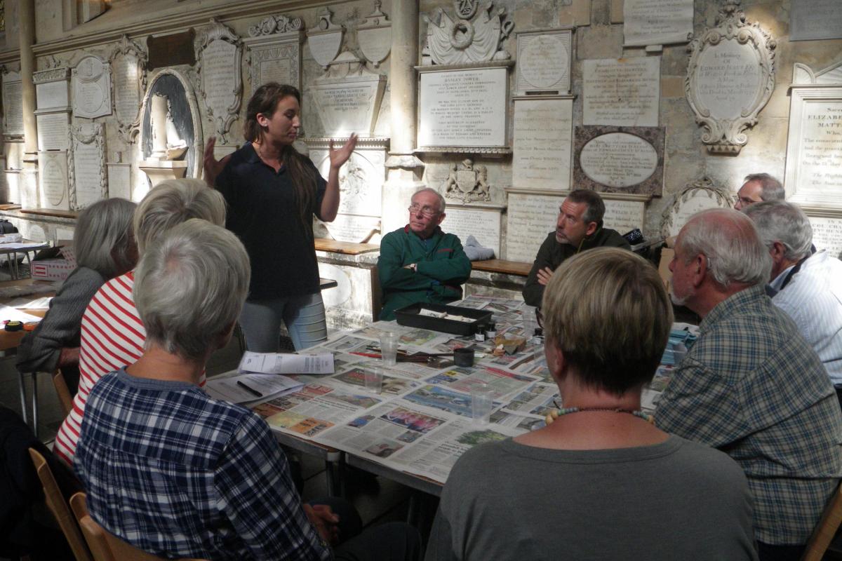 On Friday 7 September 2018, Sue Nelson and Sophie Clarke (both team members from the Finds Department) travelled to Bath Abbey to conduct a training session with ten of the Abbey’s volunteers. Accompanying the event was Oliver Taylor (Head of Interpretation, Learning and Engagement), Anna Riggs (Abbey Archivist) and Frank Mowat (Executive Director).